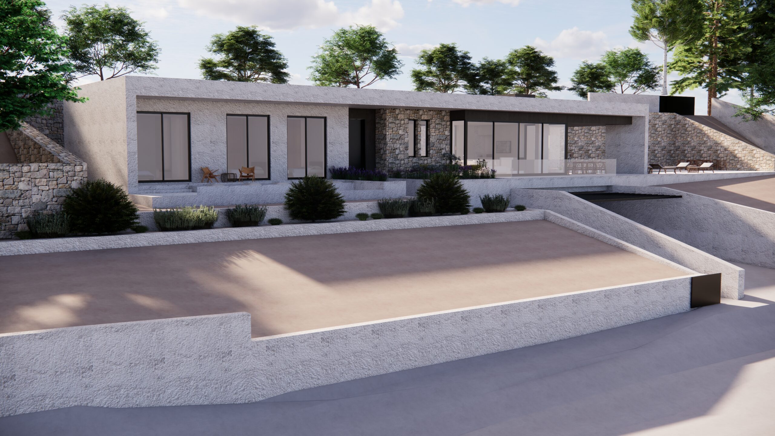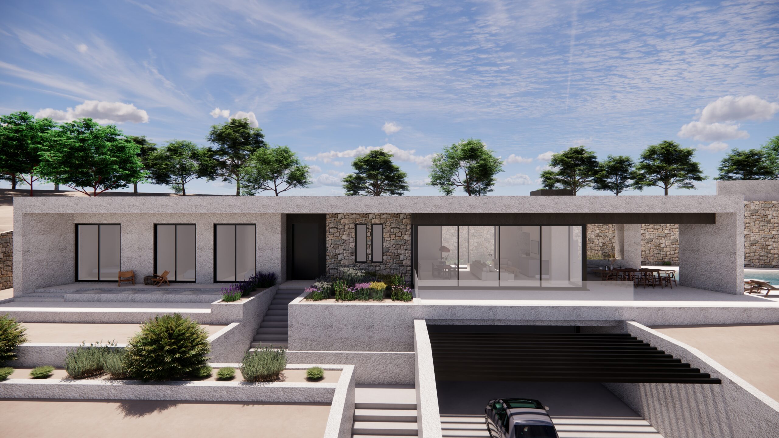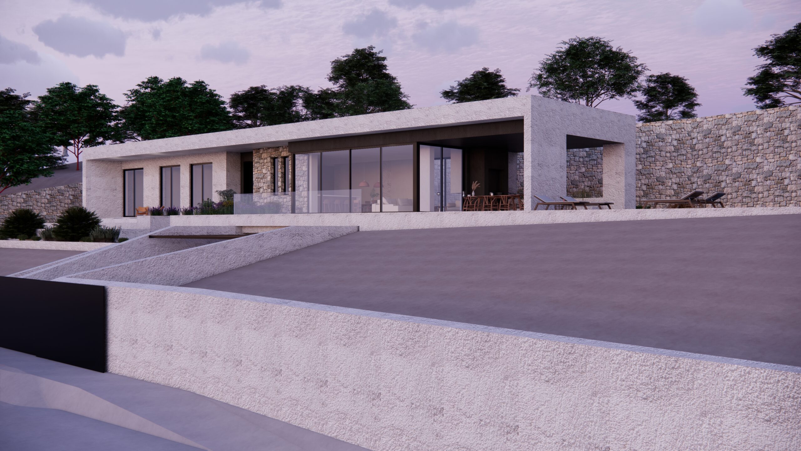 Λόγω της γεωμετρίας του οικοπέδου, η κάτοψη της κατοικίας οργανώνεται σε επιμήκη μορφή, με μεγάλα ανοίγματα στραμμένα προς τη θέα. Η έντονη κλίση του εδάφους οδήγησε στην τοποθέτηση του κτιρίου στο κέντρο του οικοπέδου, προκειμένου να αξιοποιηθεί πλήρως το φυσικό ανάγλυφο και η θέα. Στο πίσω μέρος, διαμορφώνεται πέτρινος τοίχος αντιστήριξης σε απόσταση διαδρόμου από το κτίριο. Η επιλογή να αντιμετωπιστεί το κτίριο ως ένας ισόγειος επιμήκης όγκος δημιουργεί την αίσθηση υπόσκαφης κατοικίας και συμβάλλει, μέσω της χρωματικής παλέτας, στην αρμονική ένταξή του στο περιβάλλον.