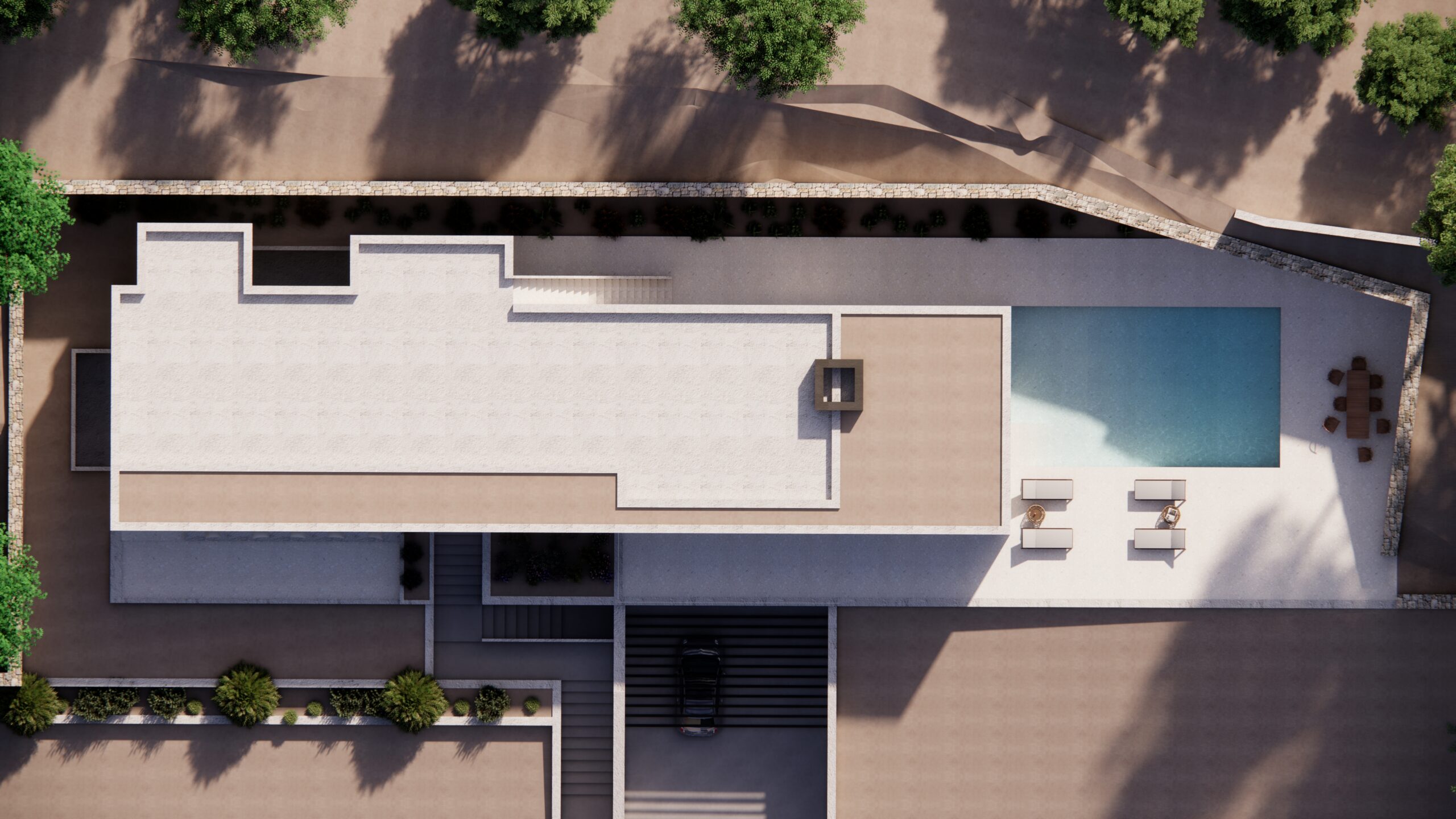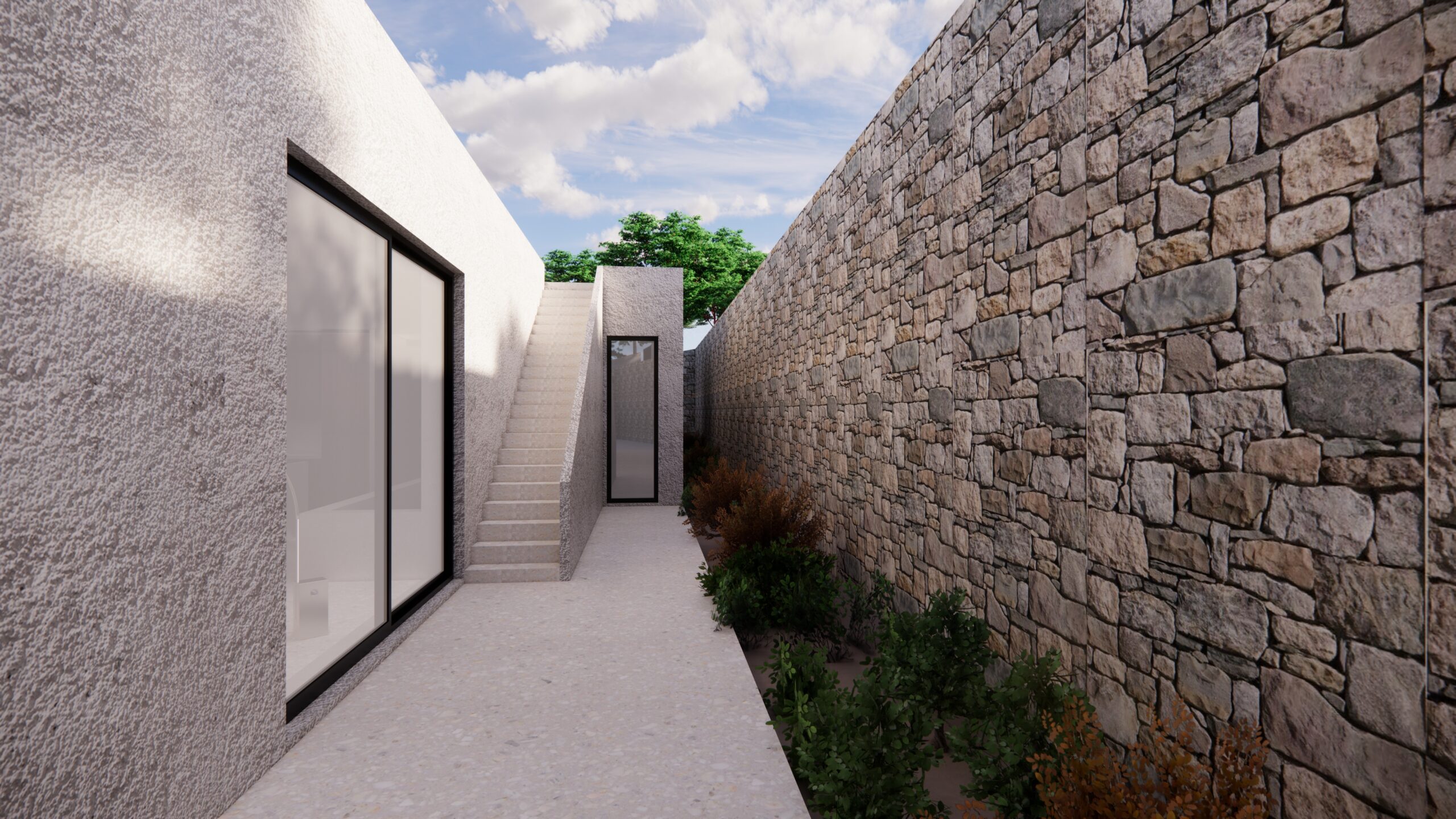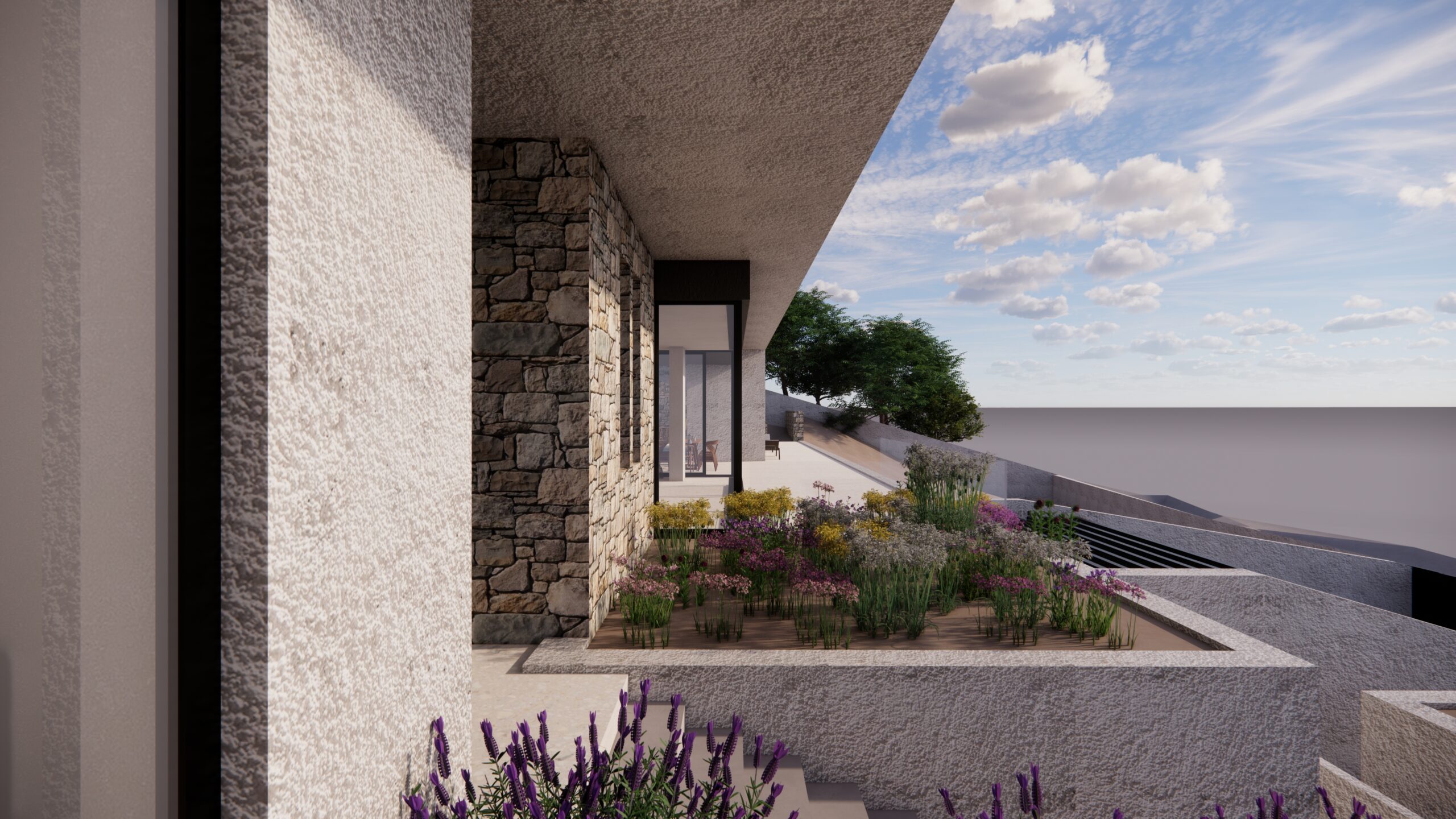 Λόγω της γεωμετρίας του οικοπέδου, η κάτοψη της κατοικίας οργανώνεται σε επιμήκη μορφή, με μεγάλα ανοίγματα στραμμένα προς τη θέα. Η έντονη κλίση του εδάφους οδήγησε στην τοποθέτηση του κτιρίου στο κέντρο του οικοπέδου, προκειμένου να αξιοποιηθεί πλήρως το φυσικό ανάγλυφο και η θέα. Στο πίσω μέρος, διαμορφώνεται πέτρινος τοίχος αντιστήριξης σε απόσταση διαδρόμου από το κτίριο. Η επιλογή να αντιμετωπιστεί το κτίριο ως ένας ισόγειος επιμήκης όγκος δημιουργεί την αίσθηση υπόσκαφης κατοικίας και συμβάλλει, μέσω της χρωματικής παλέτας, στην αρμονική ένταξή του στο περιβάλλον.