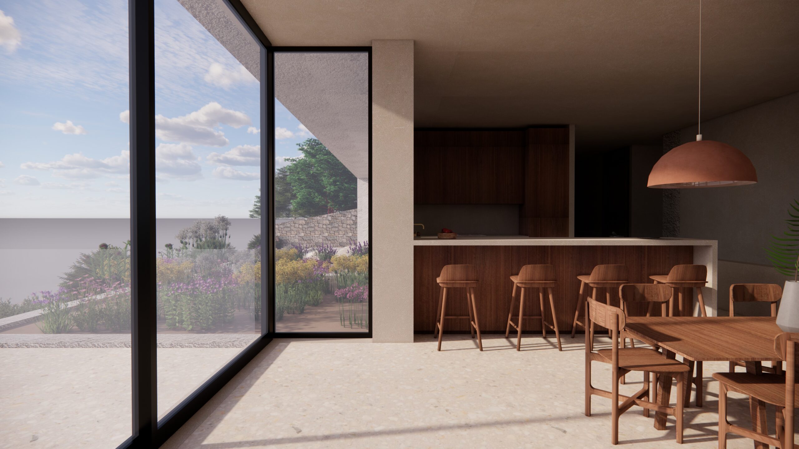Η είσοδος τοποθετείται στο κέντρο της κάτοψης, επιτρέποντας την άμεση διάκριση των ζωνών: προς τα αριστερά αναπτύσσονται οι ιδιωτικοί χώροι (υπνοδωμάτια και λουτρά), ενώ προς τα δεξιά βρίσκονται οι χώροι διημέρευσης. Δεδομένης της θέσης της κατοικίας εκτός του αστικού ιστού, βασικός στόχος υπήρξε η αβίαστη σύνδεση της εσωτερικής με την εξωτερική ζωή. Το καθιστικό ενοποιείται πλήρως με τον εξωτερικό χώρο καθιστικού και BBQ μέσω της μεγάλης συρόμενης τζαμαρίας, ενώ η συνεχόμενη οροφή επεκτείνεται και πάνω από το εξωτερικό καθιστικό, ενισχύοντας την αίσθηση συνέχειας και τη βιωματική εμπειρία ενότητας του μέσα και του έξω.