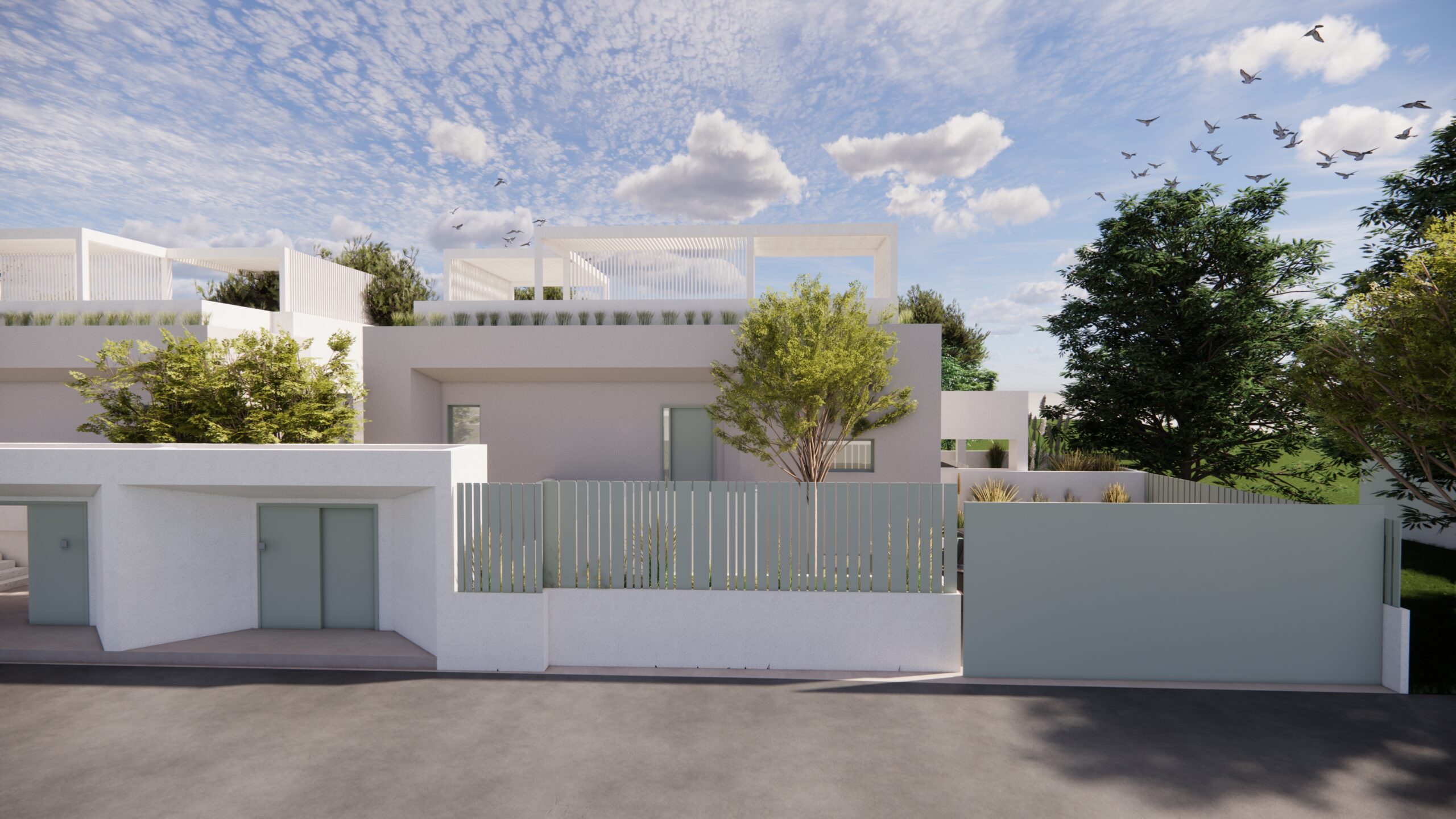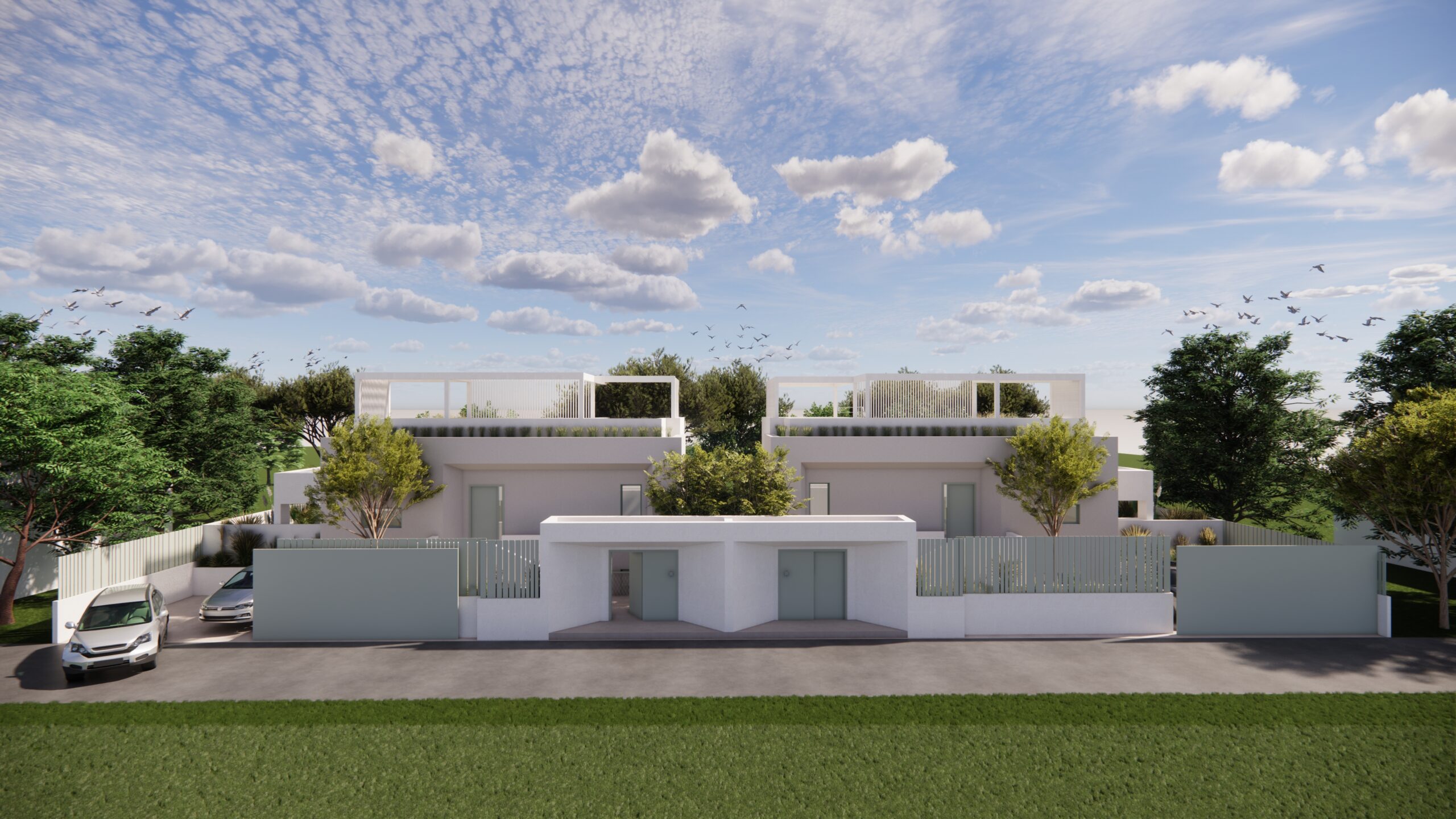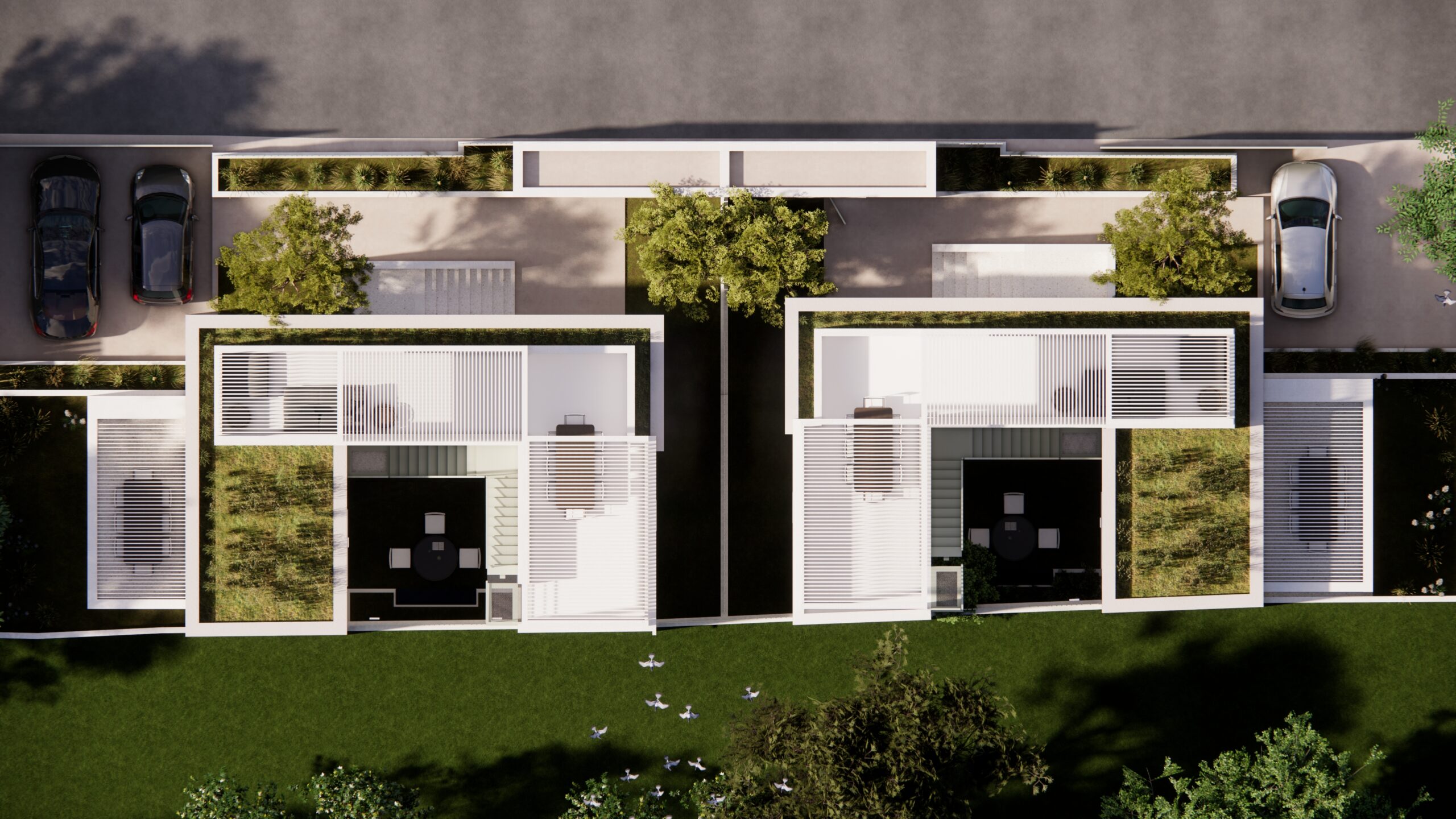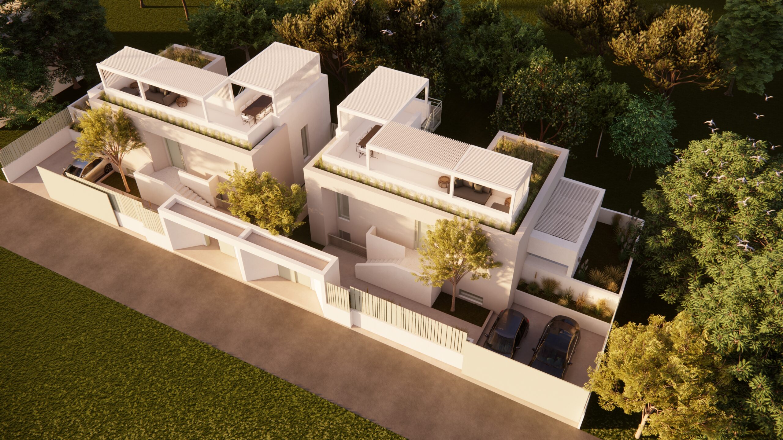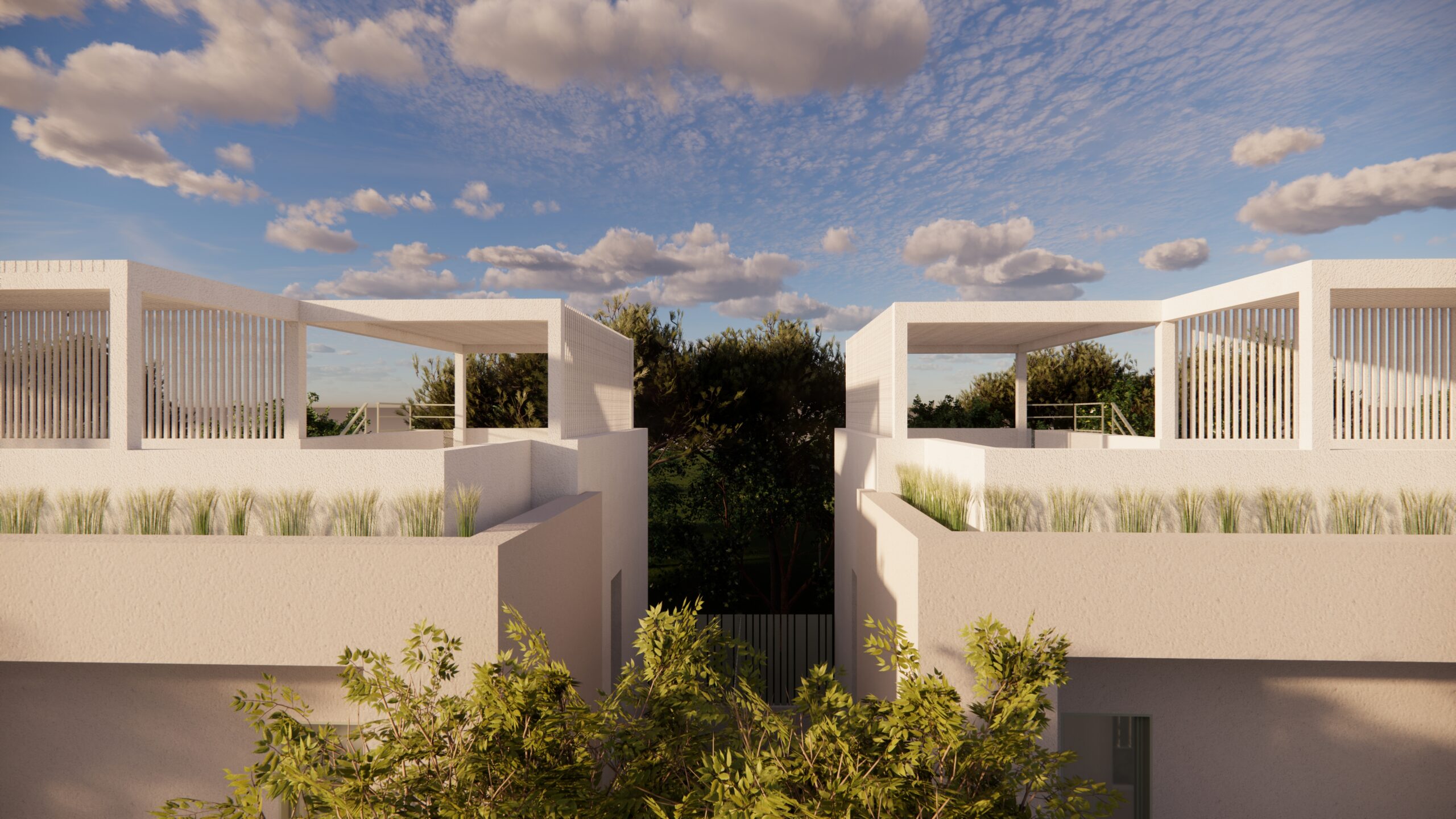 Από το ίδιο το αίθριο, μια εξωτερική μεταλλική σκάλα οδηγεί στην ταράτσα της εκάστοτε κατοικίας, ενισχύοντας την κάθετη σύνδεση των χώρων και επιτρέποντας την πρόσβαση σε ένα επιπλέον υπαίθριο επίπεδο χρήσης, με θέα προς το γύρω τοπίο. Η σύνθεση βασίζεται σε καθαρές γεωμετρίες και λιτή υλικότητα, επιδιώκοντας μια σύγχρονη, ήρεμη και διαχρονική αρχιτεκτονική έκφραση.