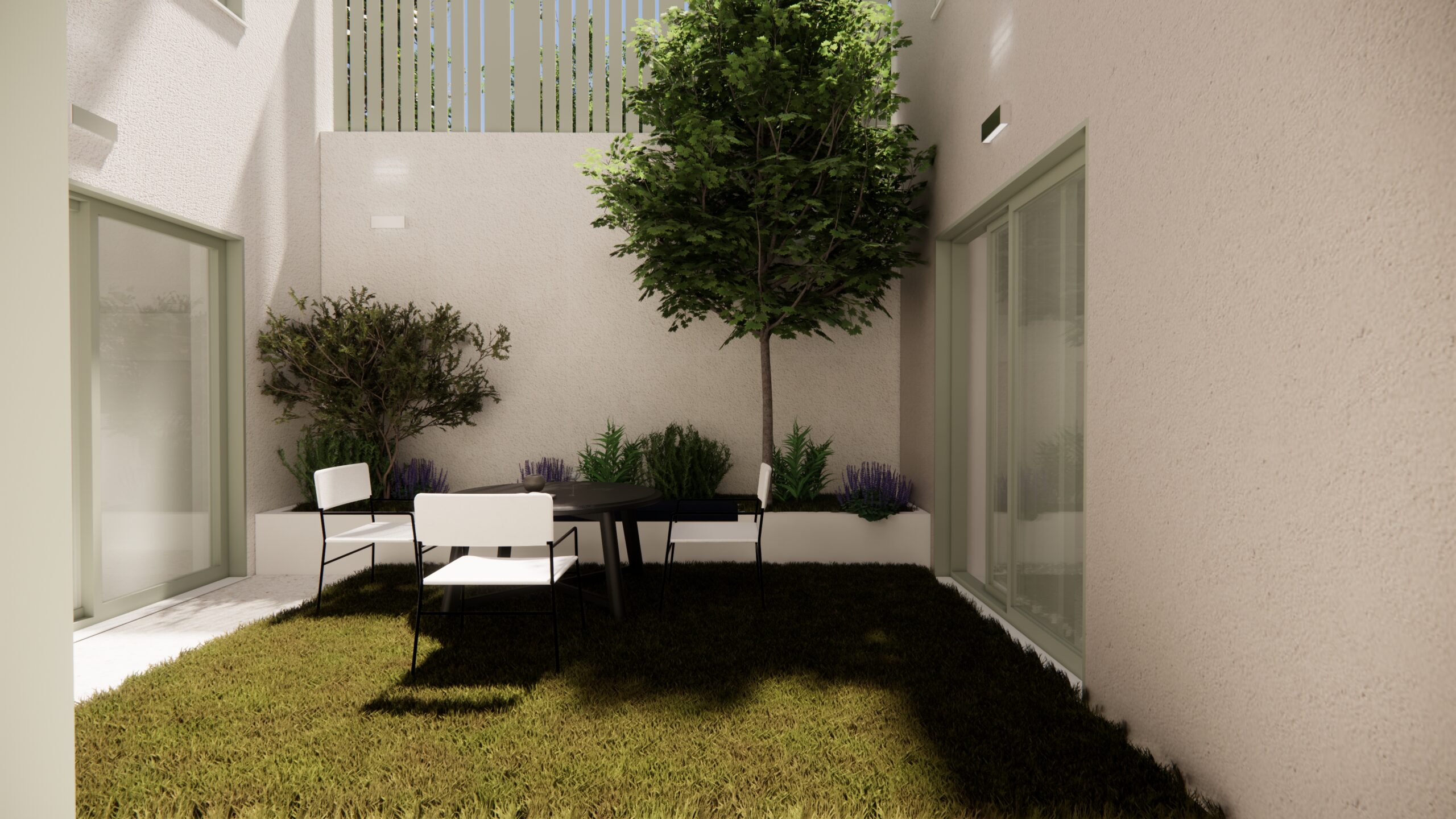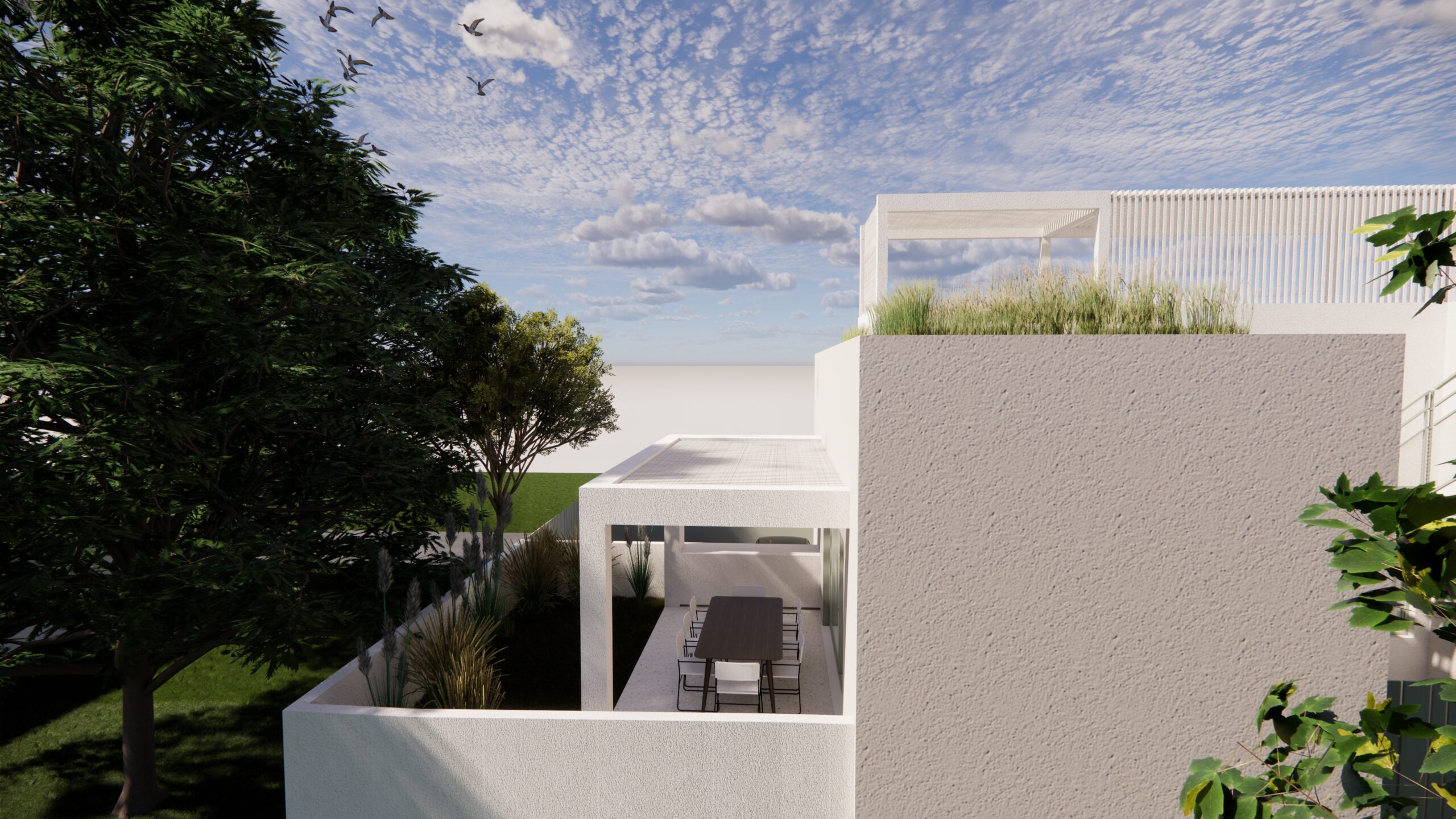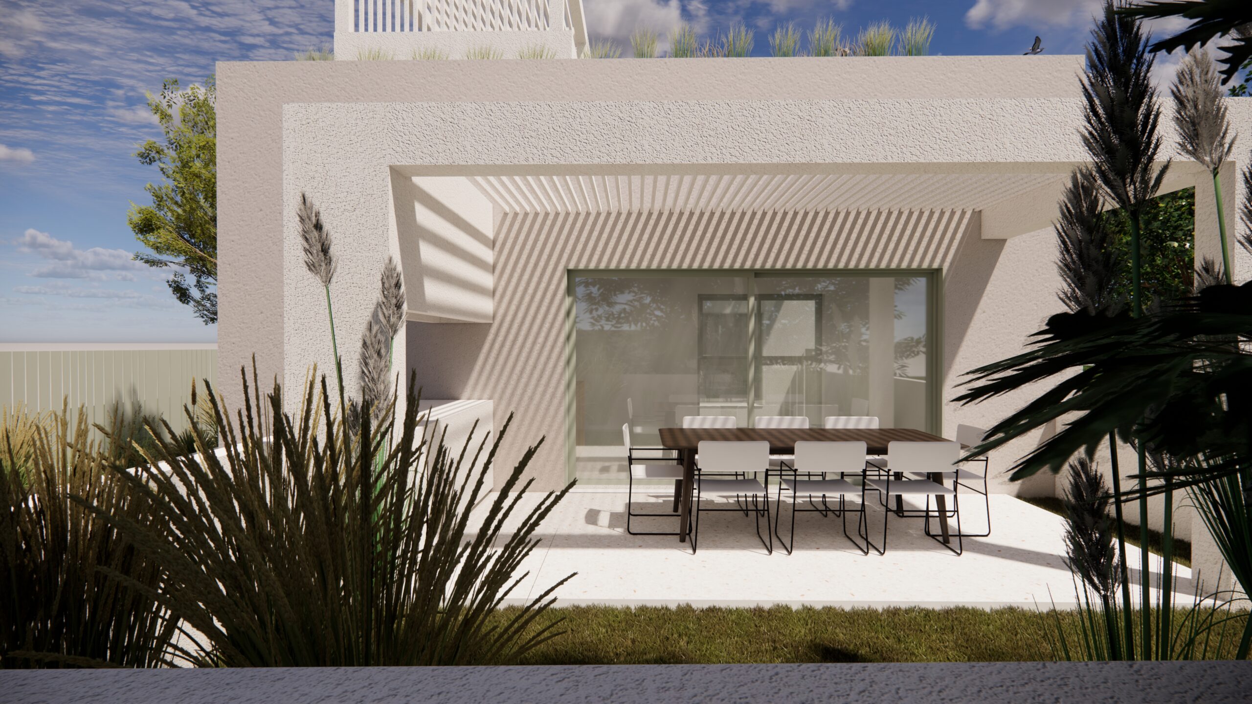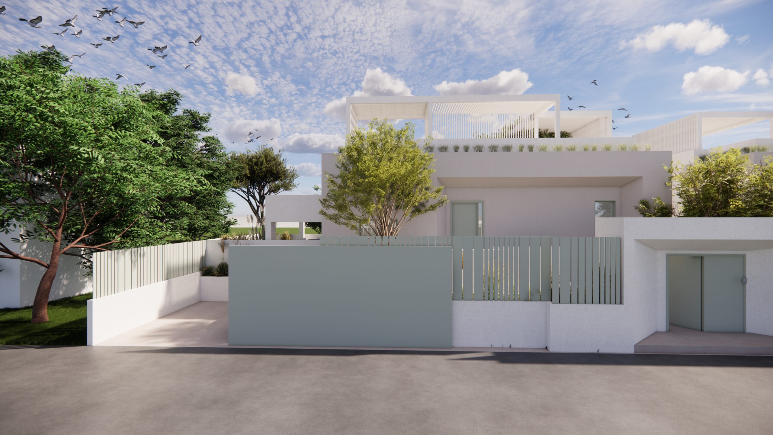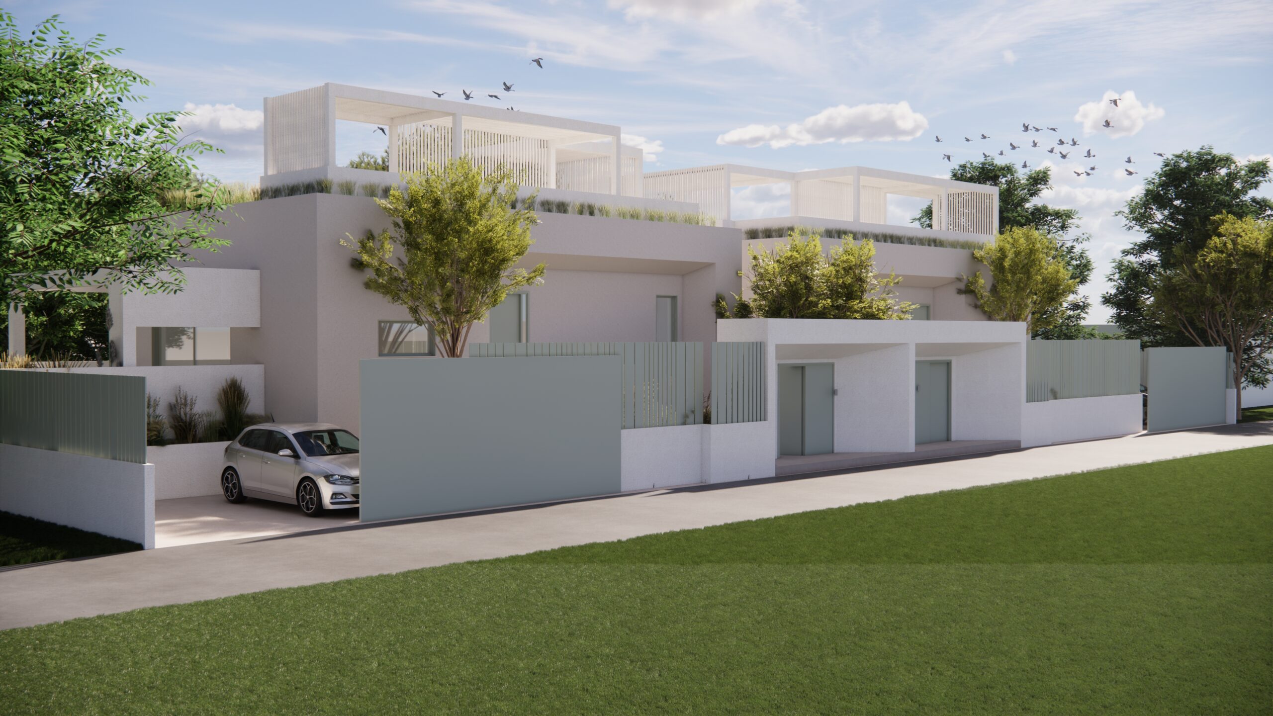 Από το ίδιο το αίθριο, μια εξωτερική μεταλλική σκάλα οδηγεί στην ταράτσα της εκάστοτε κατοικίας, ενισχύοντας την κάθετη σύνδεση των χώρων και επιτρέποντας την πρόσβαση σε ένα επιπλέον υπαίθριο επίπεδο χρήσης, με θέα προς το γύρω τοπίο. Η σύνθεση βασίζεται σε καθαρές γεωμετρίες και λιτή υλικότητα, επιδιώκοντας μια σύγχρονη, ήρεμη και διαχρονική αρχιτεκτονική έκφραση.