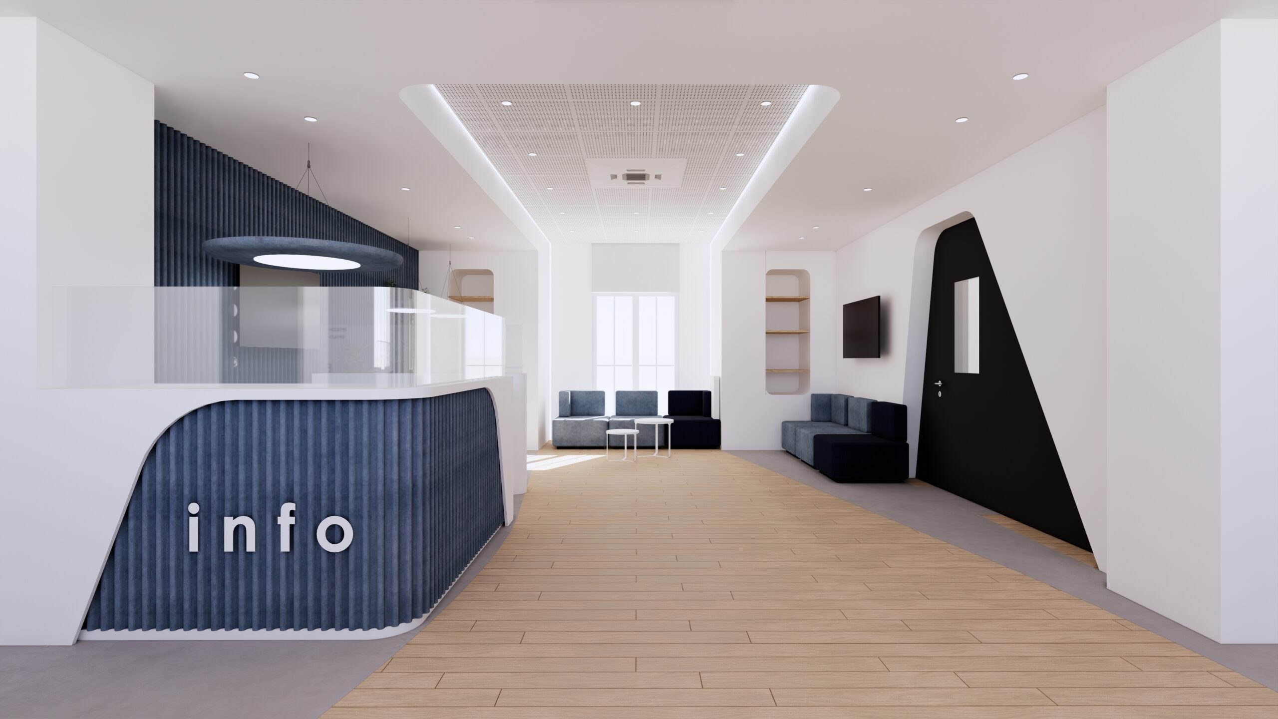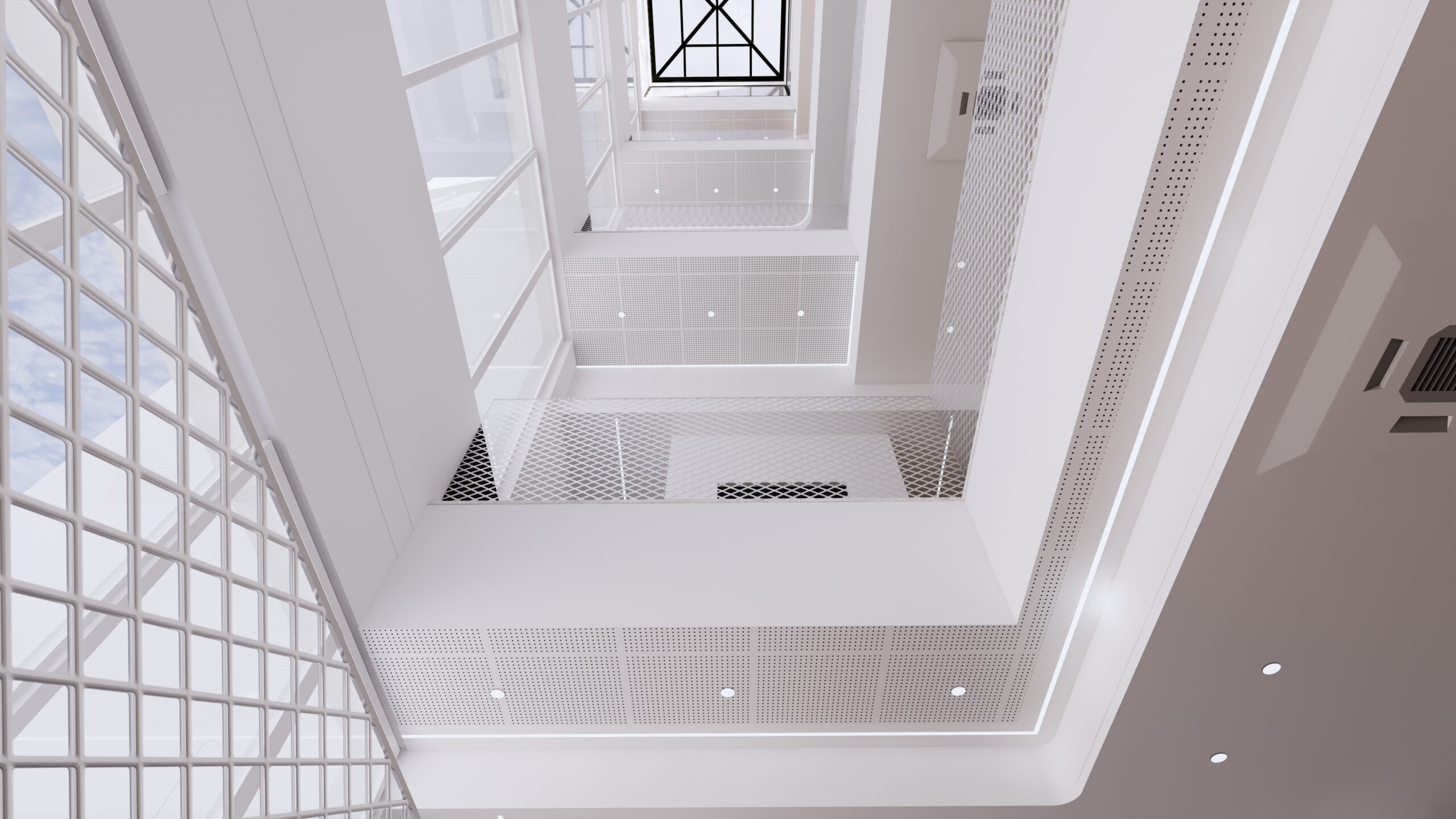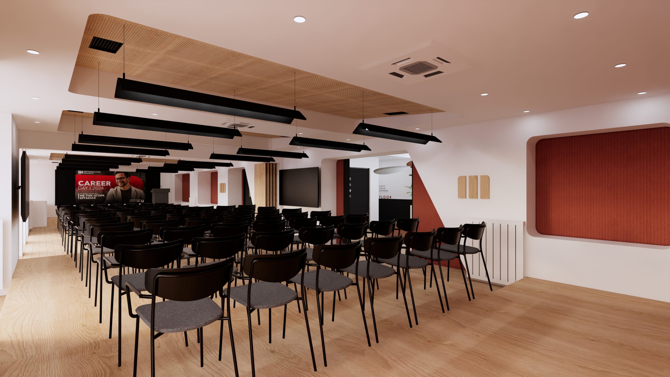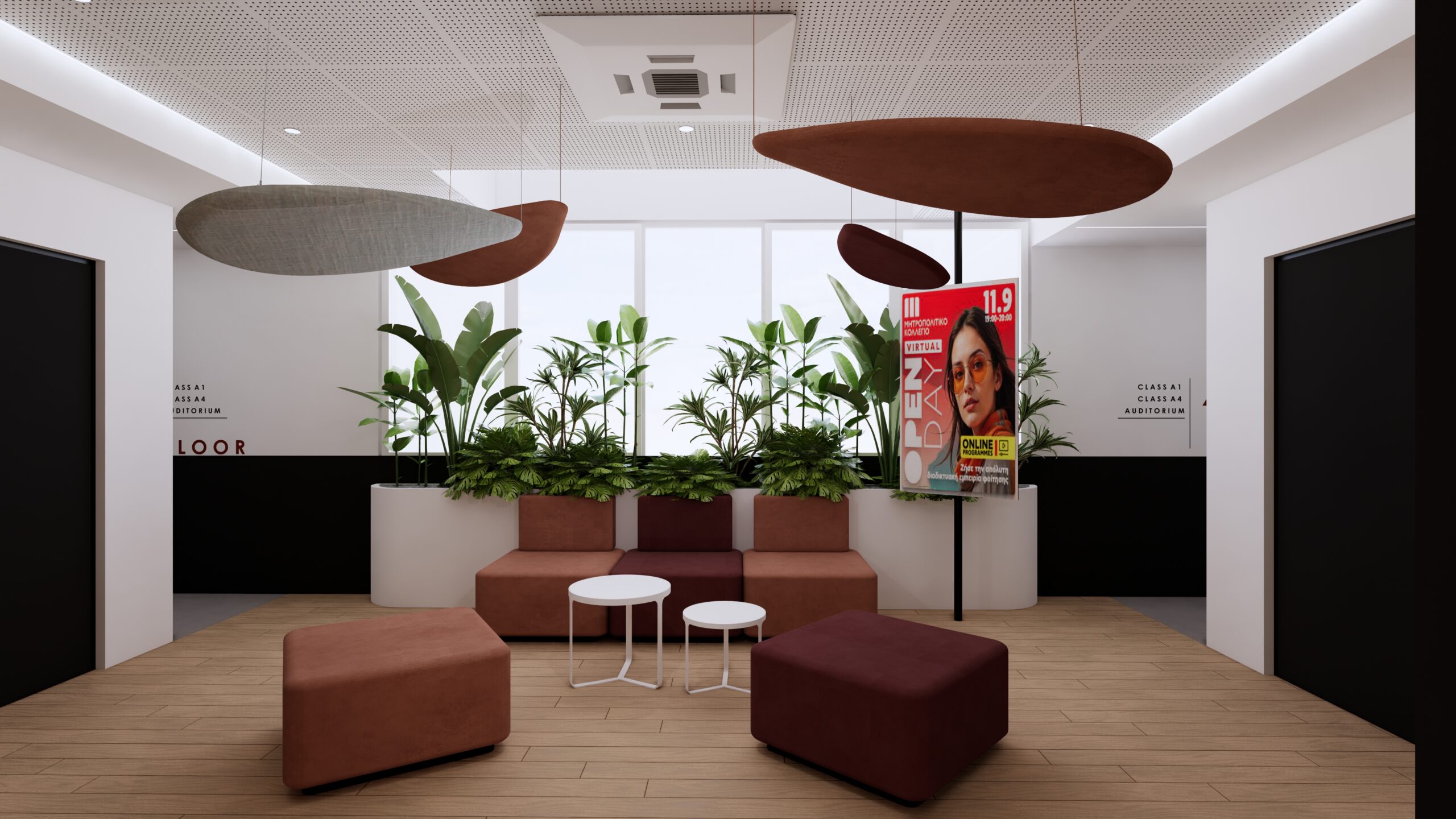 Το ισόγειο και ο ημιώροφος, λόγω του περιορισμένου εμβαδού τους, φιλοξενούν τις λειτουργίες της υποδοχής και των γραφειακών χώρων. Από τον πρώτο έως και τον τέταρτο όροφο αναπτύσσονται οι εκπαιδευτικοί χώροι και οι ζώνες διαλείμματος, οι οποίες αξιοποιούν τον φυσικό φωτισμό που διαχέεται μέσω του κεντρικού αιθρίου, το οποίο εκτείνεται καθ’ ύψος σε όλο το κτίριο.