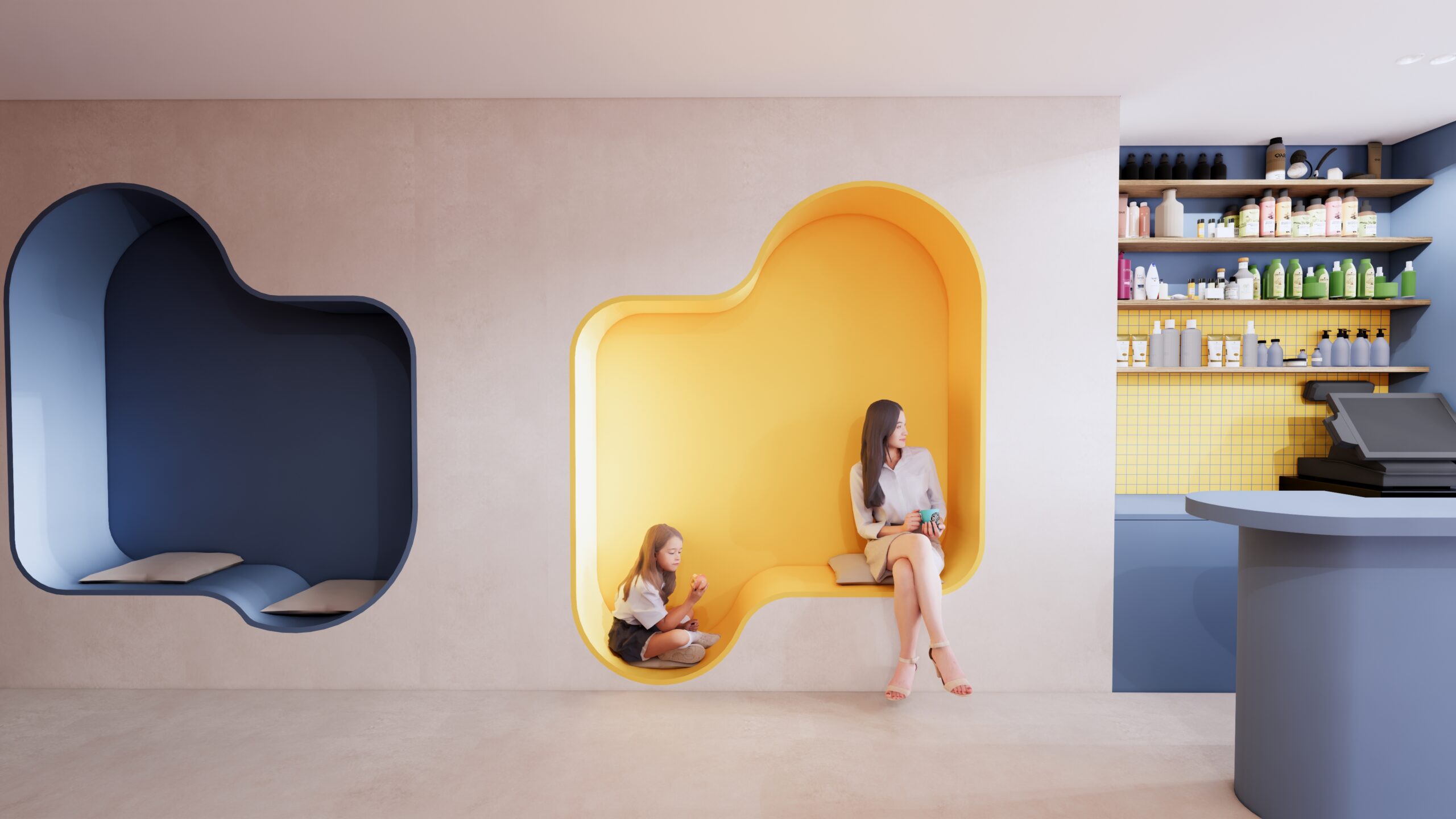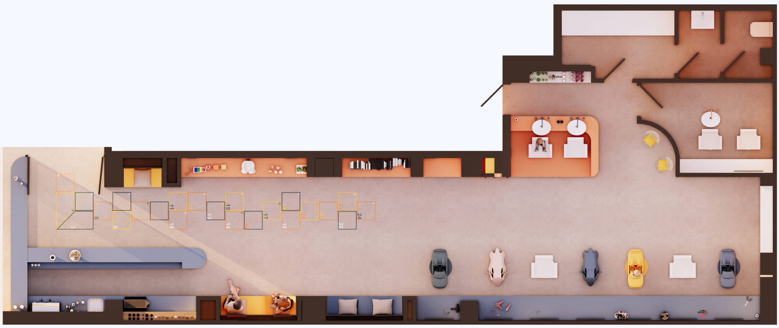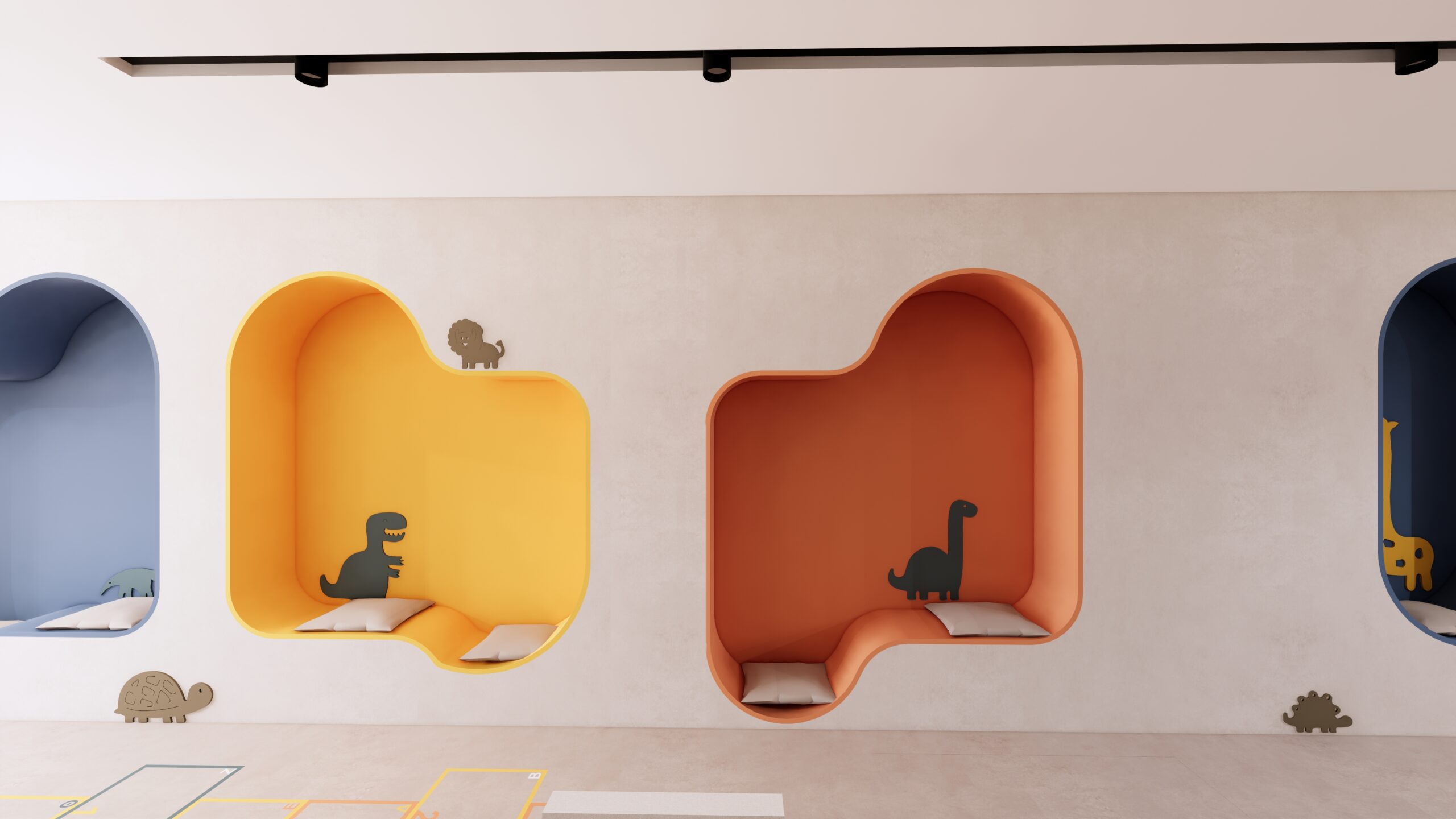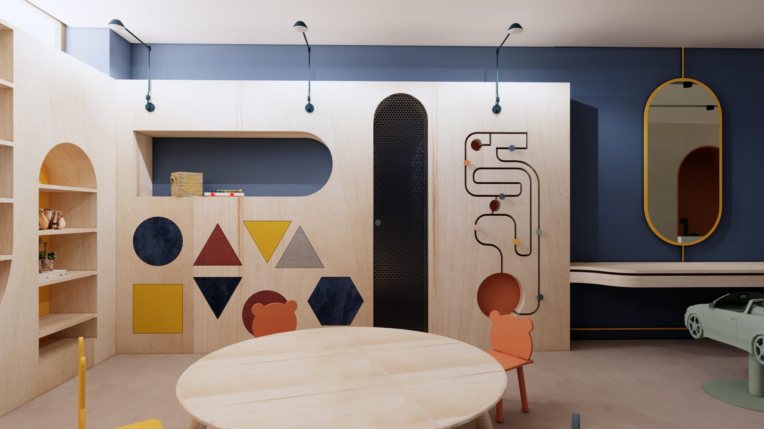 Δεδομένου ότι ο χώρος απευθύνεται σε παιδιά μικρής ηλικίας, ο σχεδιασμός επιδιώκει να εντάξει το παιχνίδι και τη φαντασία σε κάθε στάδιο της εμπειρίας. Μέσα από εσοχές στους τοίχους, έντονες χρωματικές παρεμβάσεις και εναλλαγές υφών σε τοίχους και δάπεδο, διαμορφώνεται ένα περιβάλλον που διεγείρει τις αισθήσεις και ενθαρρύνει την περιέργεια, δημιουργώντας μια συνολικά ευχάριστη και φιλική ατμόσφαιρα.