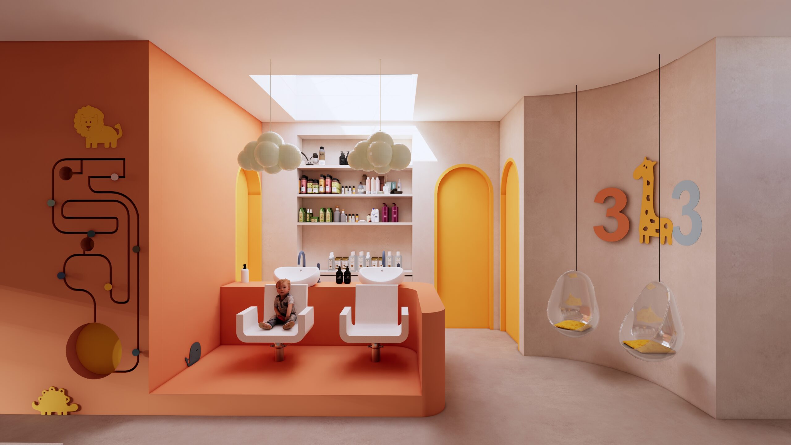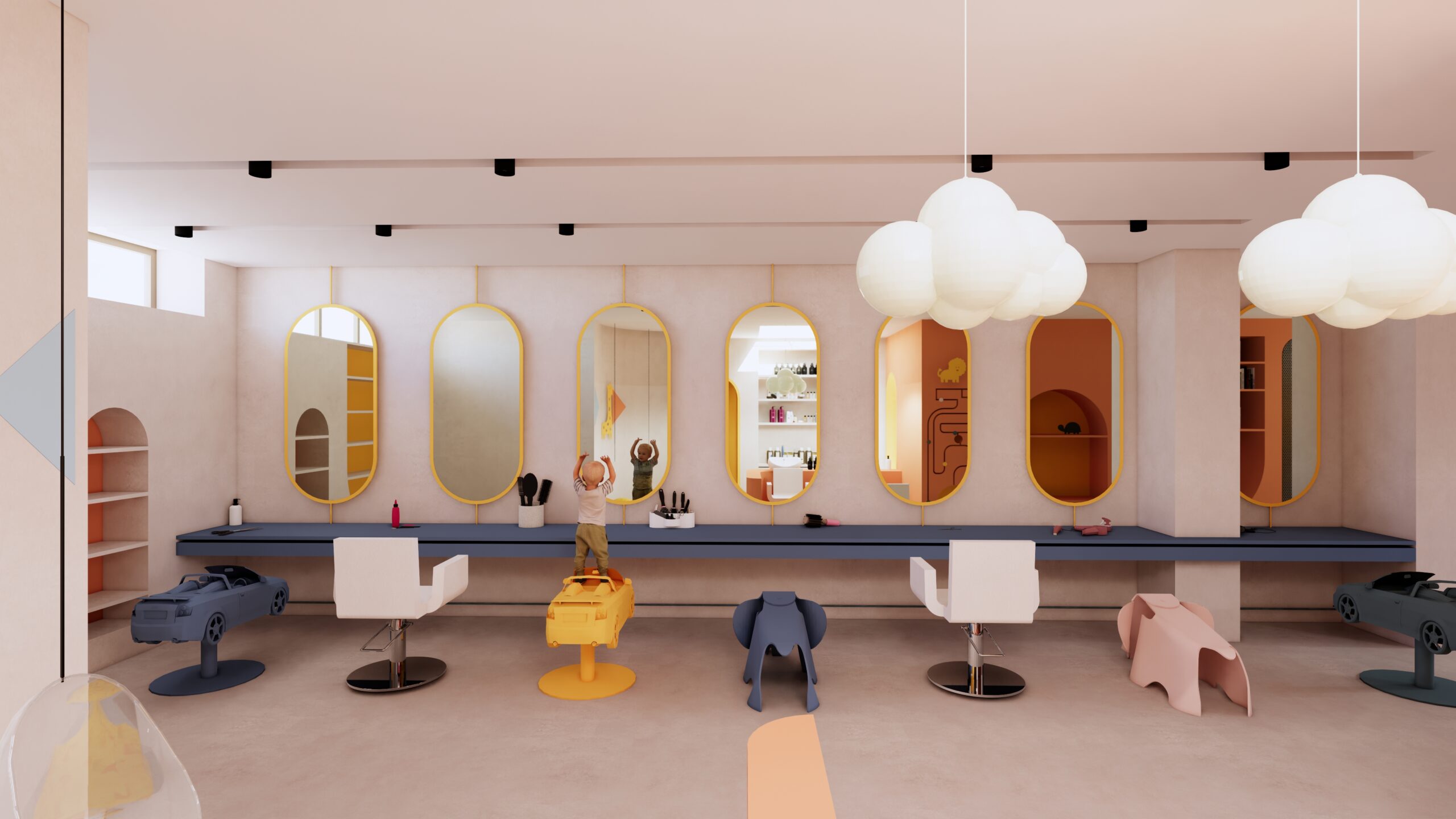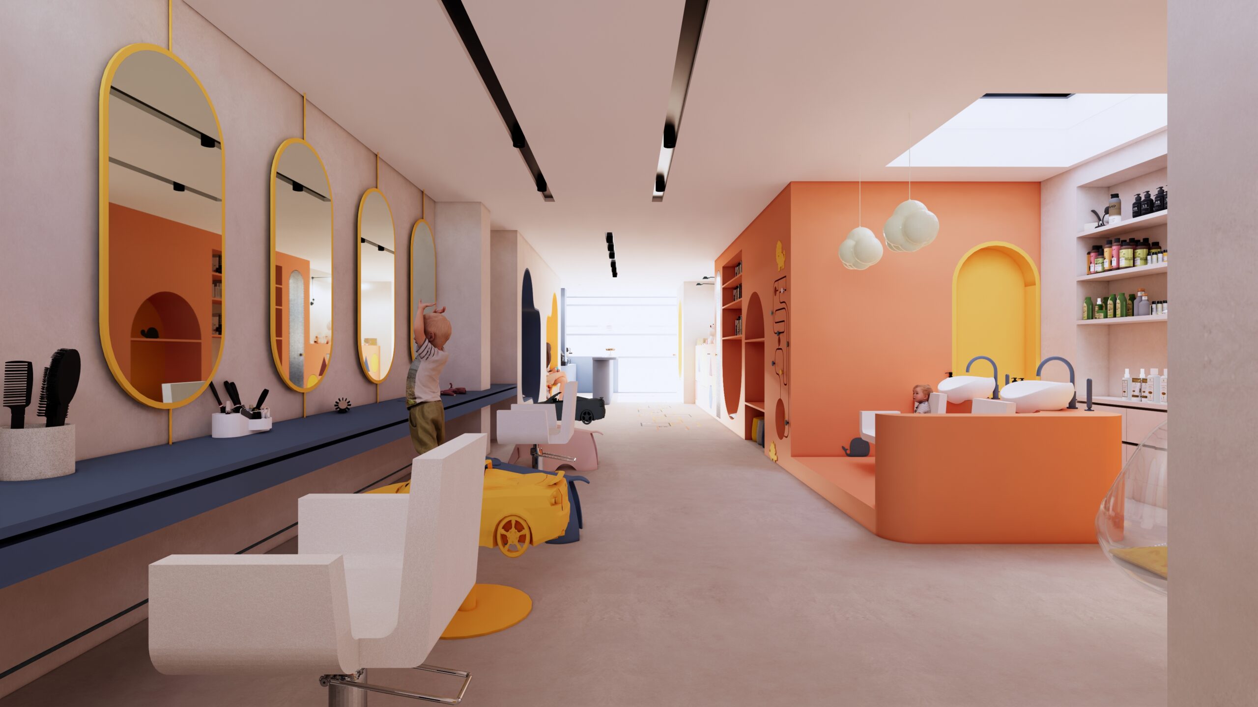 Ο χώρος, με επιμήκη κάτοψη και δύο εισόδους —μία κύρια από τον δρόμο και μία δευτερεύουσα από το εσωτερικό της πολυκατοικίας— φιλοξενεί όλες τις απαραίτητες λειτουργίες ενός κομμωτηρίου: επτά θέσεις εργασίας, λουτήρες, βοηθητικούς κλειστούς χώρους, χώρο αναμονής για γονείς και παιδιά, καθώς και σημείο παρασκευής καφέ.