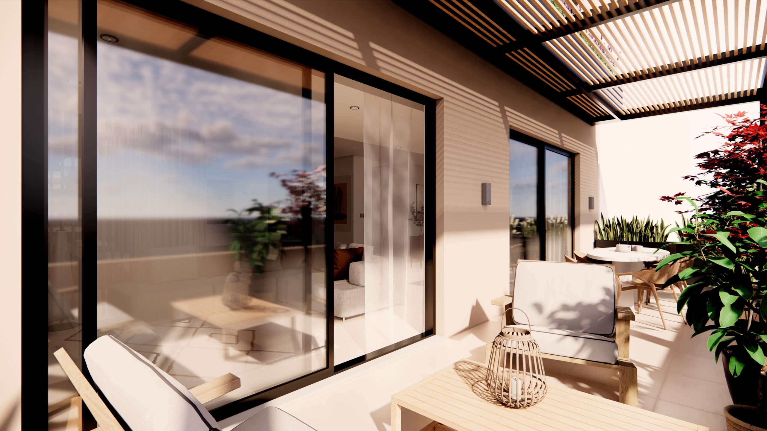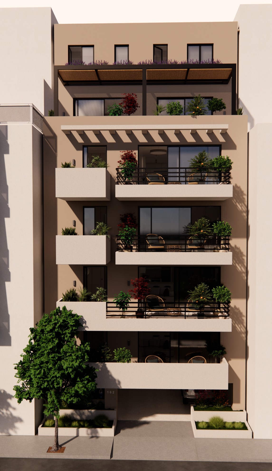 Η όψη του κτιρίου επενδύεται με θερμοπρόσοψη σε απόχρωση τερακότας, επιλογή που αποσκοπεί στη δημιουργία μιας θερμής και φιλόξενης εικόνας προς τον δρόμο, εντάσσοντας την πολυκατοικία αρμονικά στο αστικό περιβάλλον της Καλλιθέας.