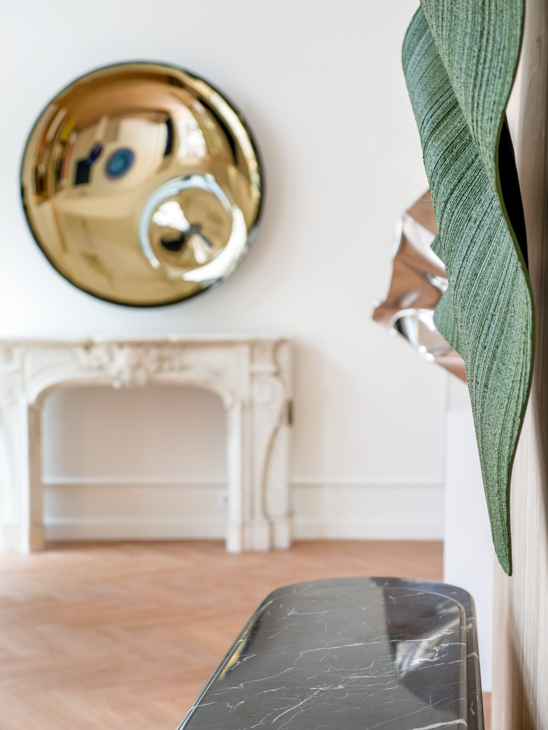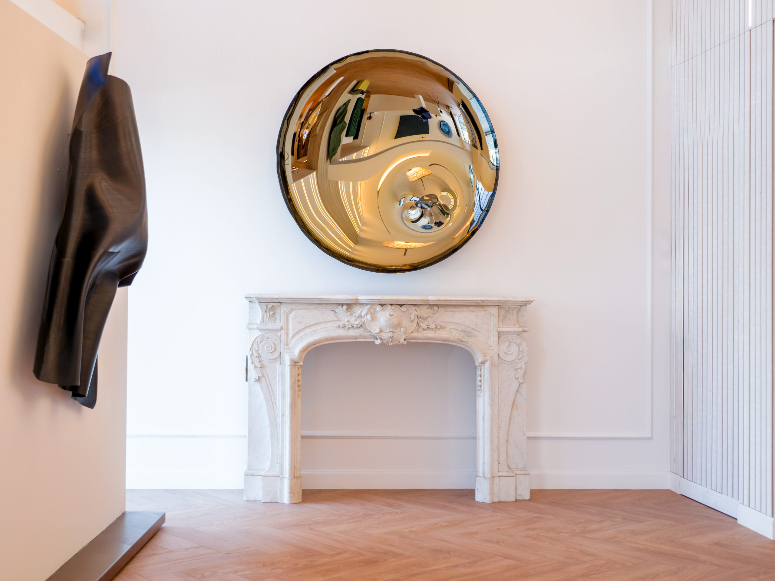 Λευκοί τοίχοι με διακριτικές λεπτομέρειες, ξύλινο δάπεδο chevron, γραμμικά φώτα, γύψινες κορνίζες, μεταλλικά κλοστρά και μπρονζέ καθρέφτες προσδίδουν στο χώρο τη νέα σύγχρονη ταυτότητα του, διατηρώντας ένα διαχρονικό και σύγχρονο ύφος που αντανακλά την ιδιοσυγκρασία του κοινού όπου απευθύνονται τα έργα.