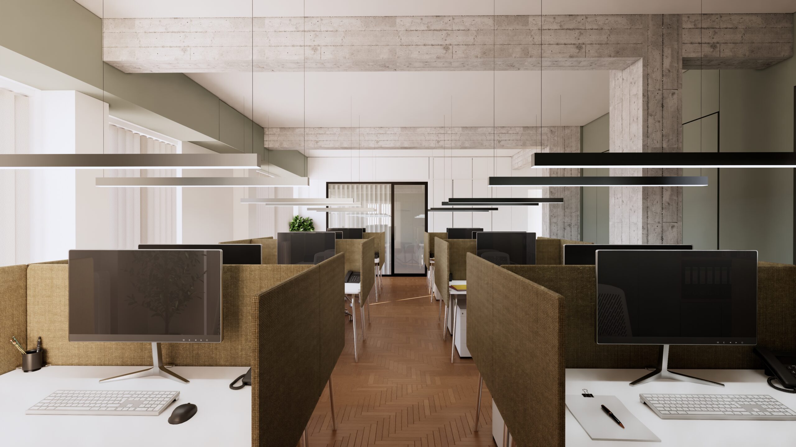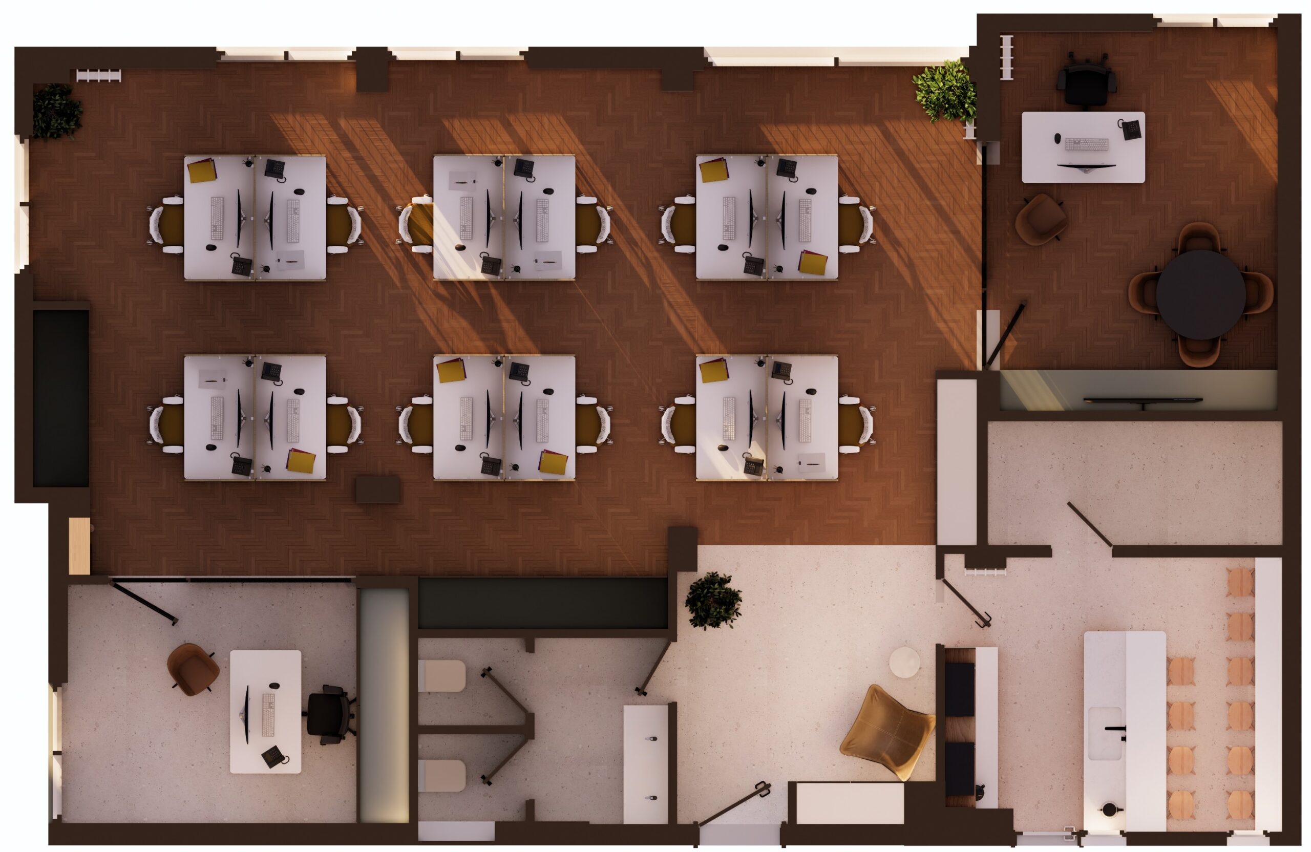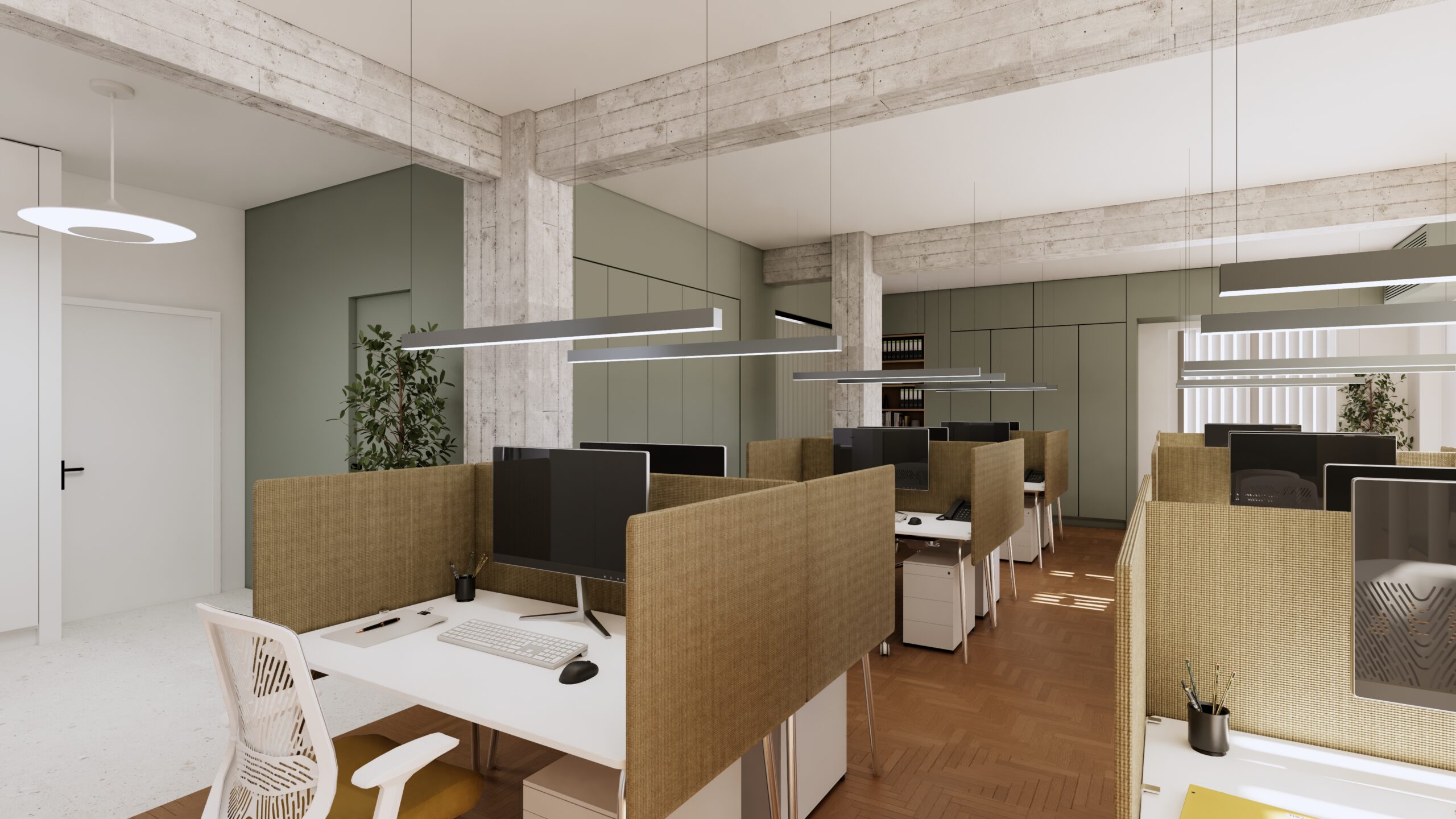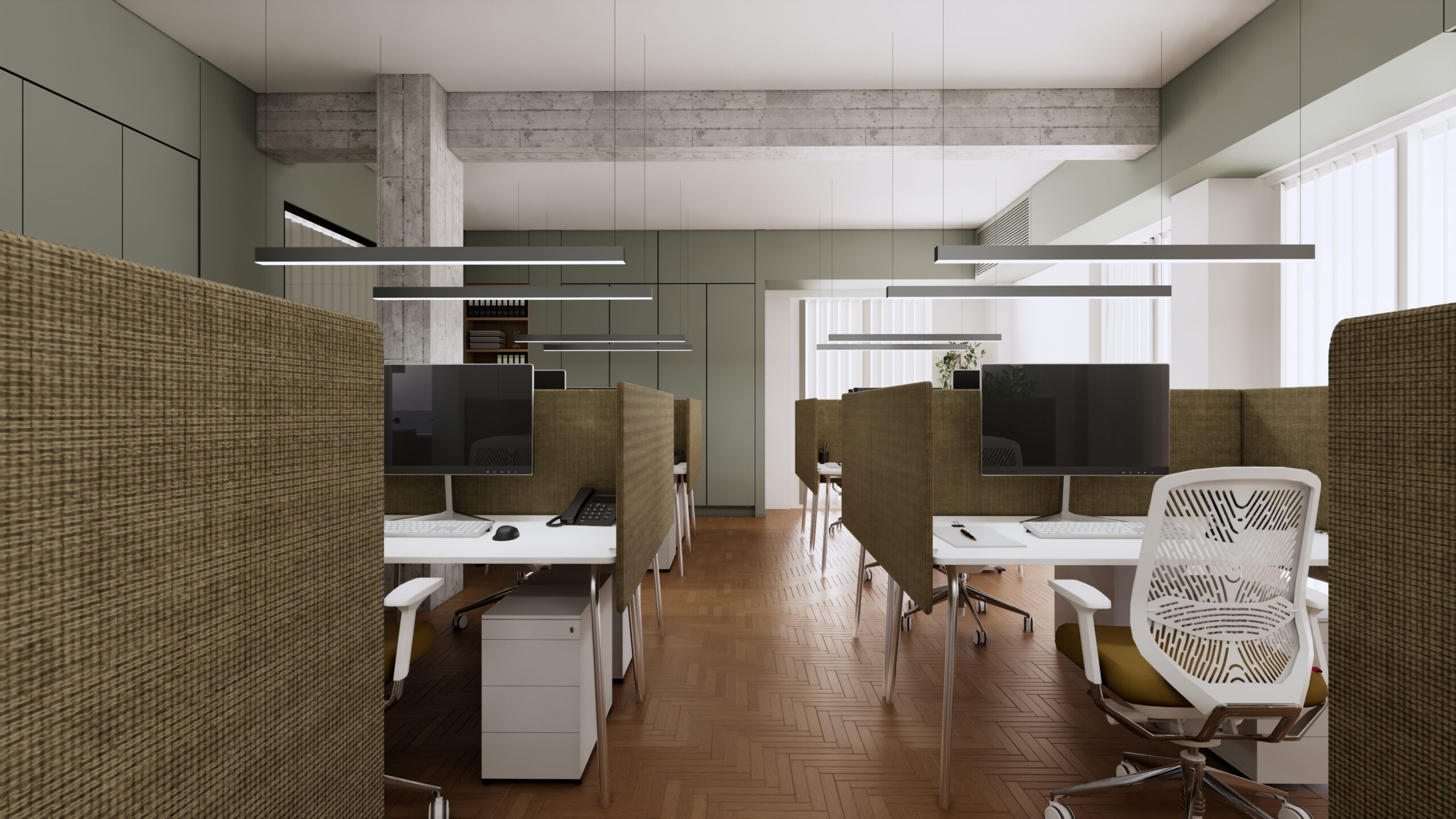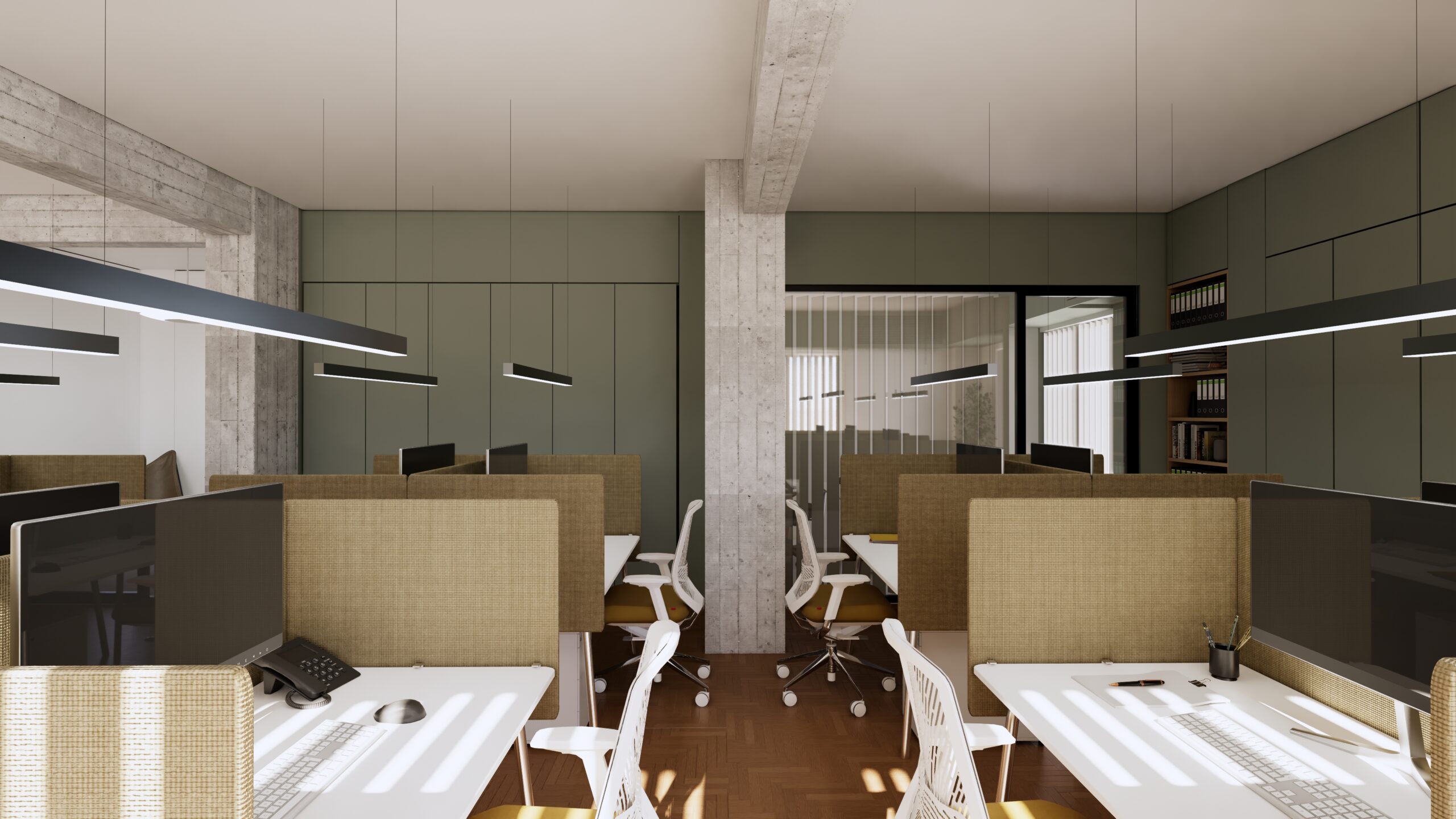 Βασική πρόθεση της μελέτης ήταν η δημιουργία ενός λειτουργικού και ευέλικτου περιβάλλοντος εργασίας, με δώδεκα θέσεις εργασίας στο κέντρο της κάτοψης και δύο κλειστά γραφεία που διατηρούν οπτική σύνδεση με τον κύριο χώρο.
