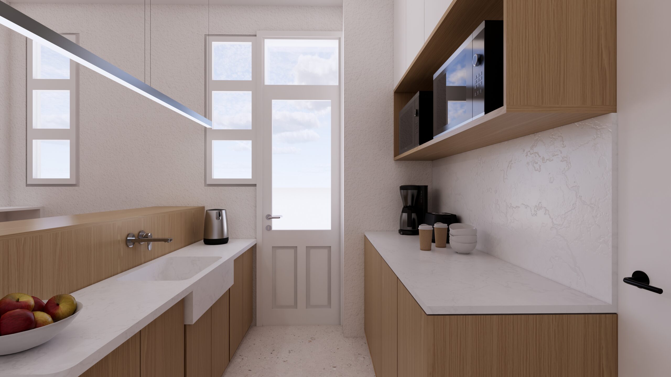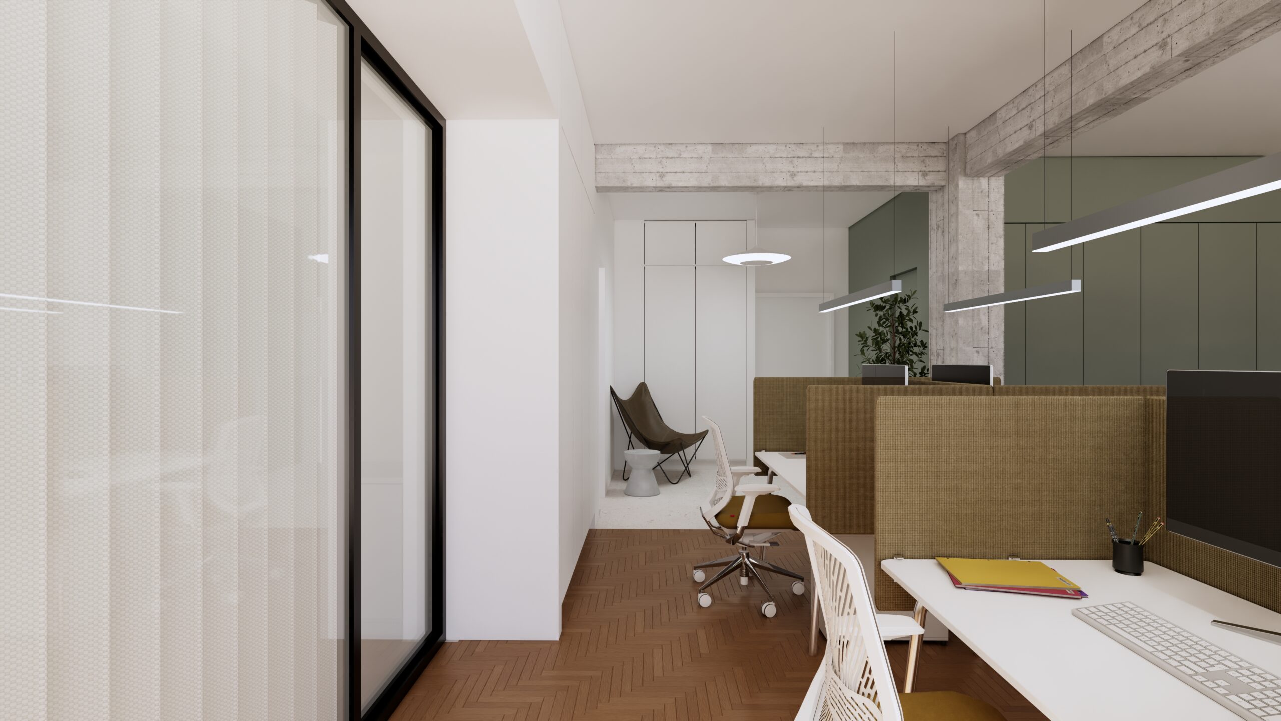 Στον κύριο χώρο των γραφείων, η απουσία ψευδοροφής ανέδειξε το ζήτημα της απόκρυψης των κλιματιστικών μονάδων και των ρολών. Η λύση δόθηκε μέσα από μια περιμετρική ξύλινη κατασκευή με ενσωματωμένα ντουλάπια, που λειτουργεί ως ψευδοδοκός και ενώνει οπτικά τους εξωτερικούς περιμετρικούς τοίχους.