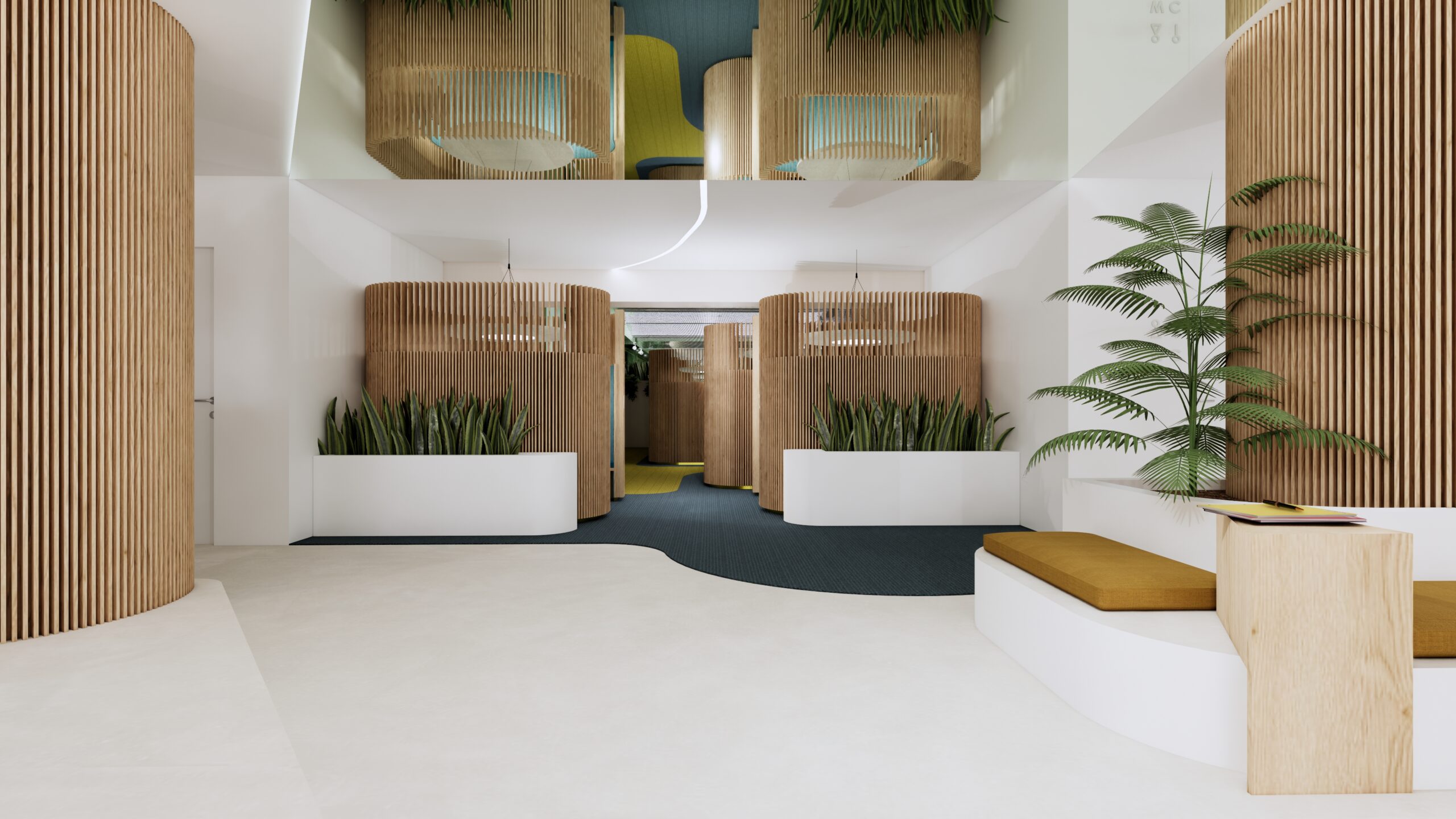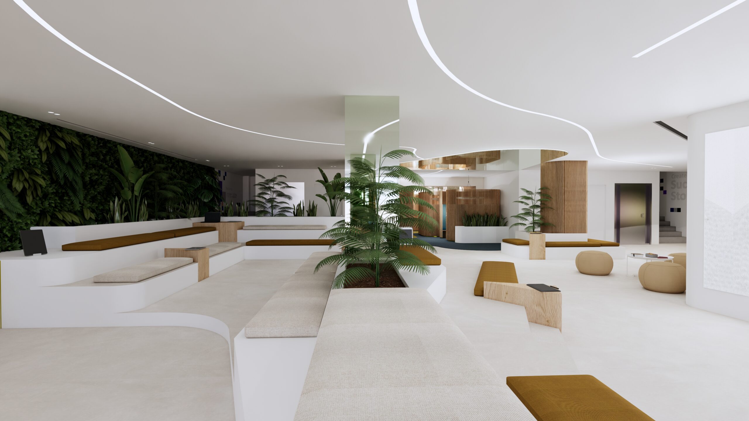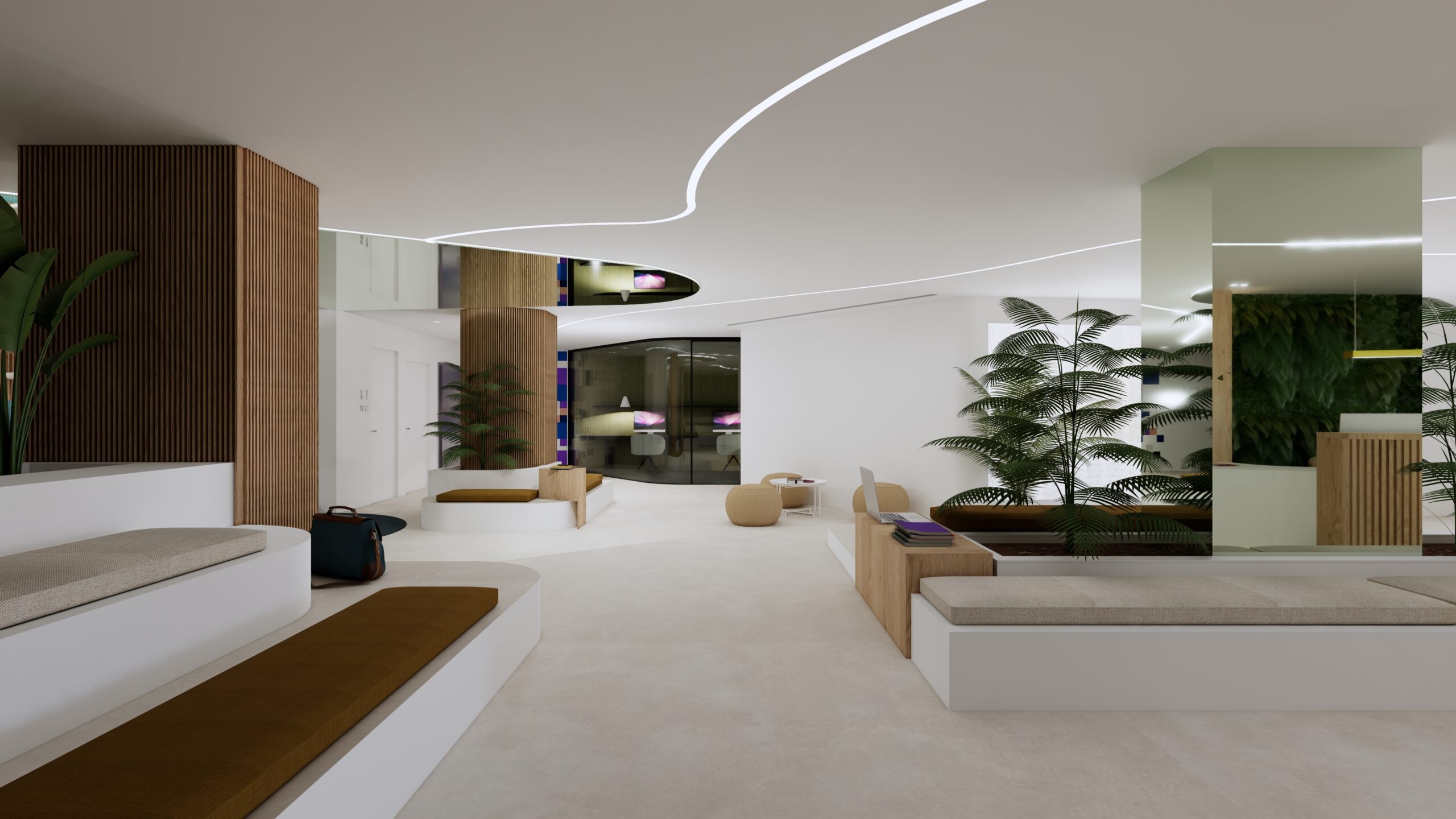 Η χωρική διάταξη επιδιώκει να ενισχύσει την αίσθηση του ανοιχτού χώρου, επιτρέποντας ροϊκή και ελεύθερη κίνηση. Στο πλαίσιο της μελέτης πραγματοποιήθηκε έρευνα για ηχομονωτικά στοιχεία και γραφειακό εξοπλισμό που συμβάλλουν στην ακουστική άνεση του χώρου. Κρεμαστά φωτιστικά, ταπετσαρίες και μοκέτες λειτουργούν τόσο ως λύσεις για τη μείωση της αντήχησης όσο και ως βασικά στοιχεία της αισθητικής ταυτότητας του interior design.