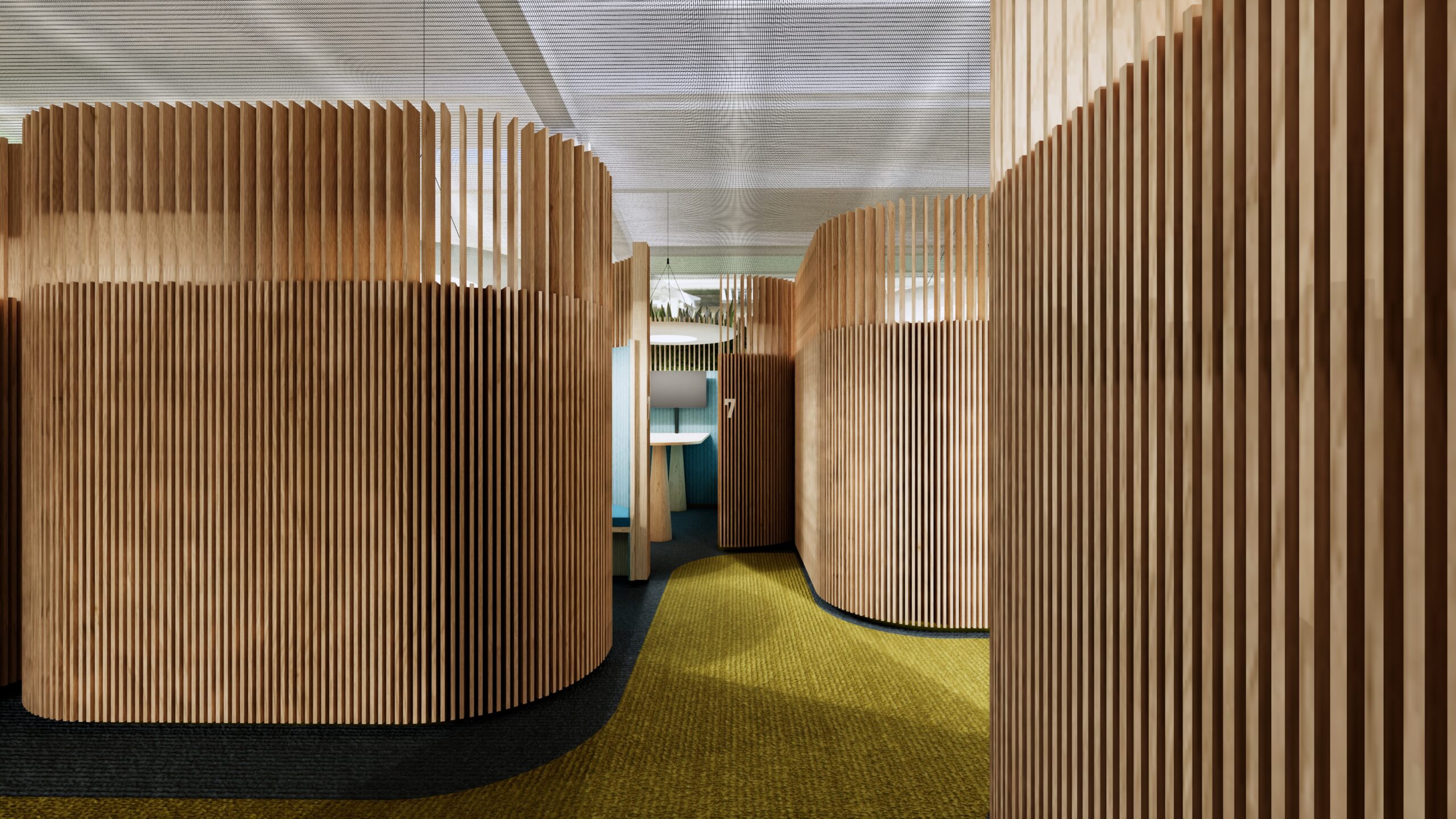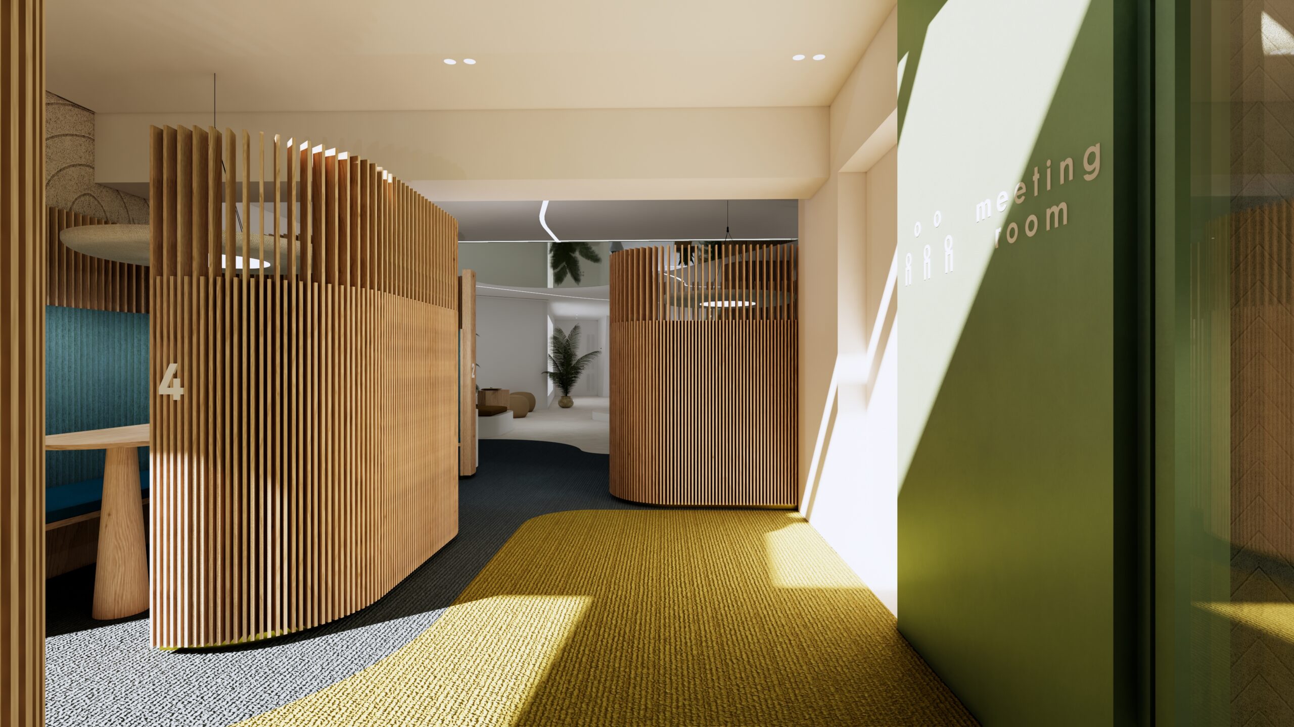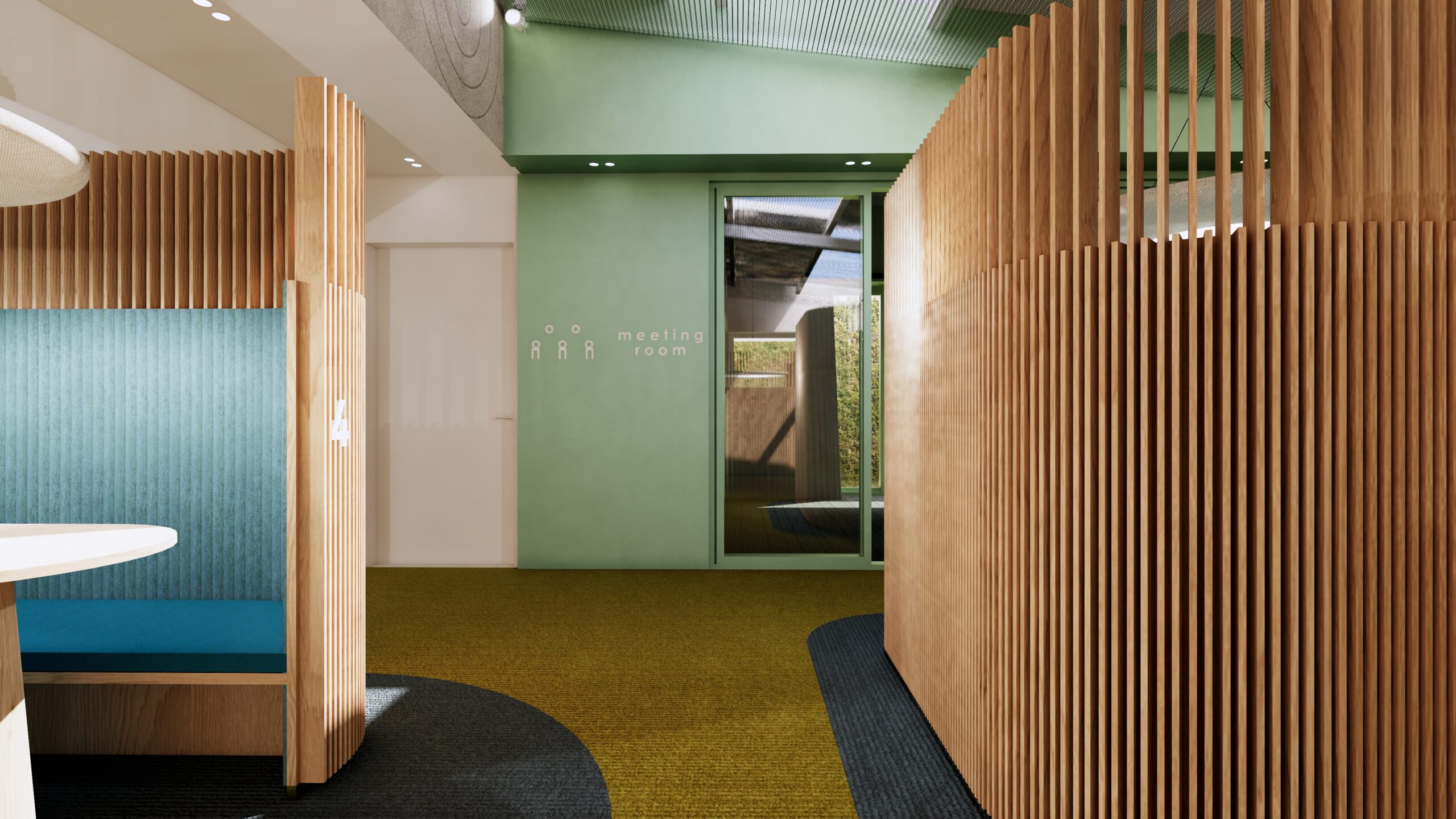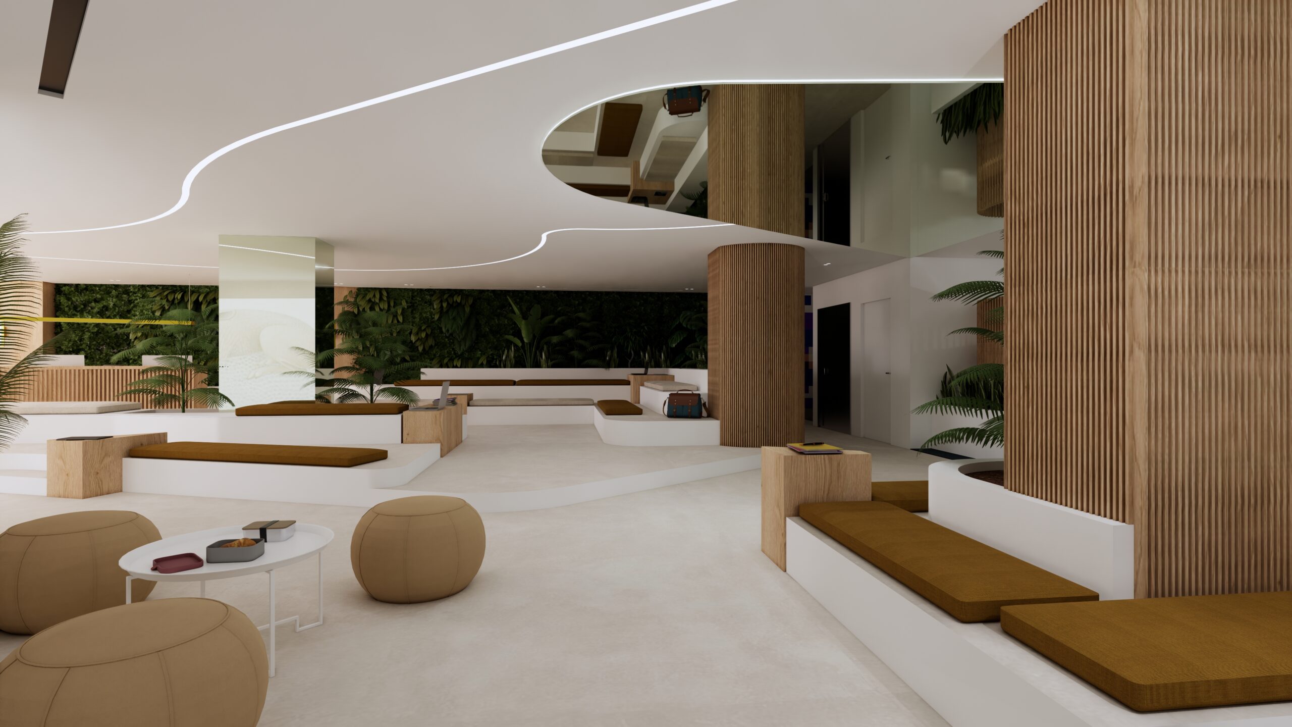 Η χωρική διάταξη επιδιώκει να ενισχύσει την αίσθηση του ανοιχτού χώρου, επιτρέποντας ροϊκή και ελεύθερη κίνηση. Στο πλαίσιο της μελέτης πραγματοποιήθηκε έρευνα για ηχομονωτικά στοιχεία και γραφειακό εξοπλισμό που συμβάλλουν στην ακουστική άνεση του χώρου. Κρεμαστά φωτιστικά, ταπετσαρίες και μοκέτες λειτουργούν τόσο ως λύσεις για τη μείωση της αντήχησης όσο και ως βασικά στοιχεία της αισθητικής ταυτότητας του interior design.